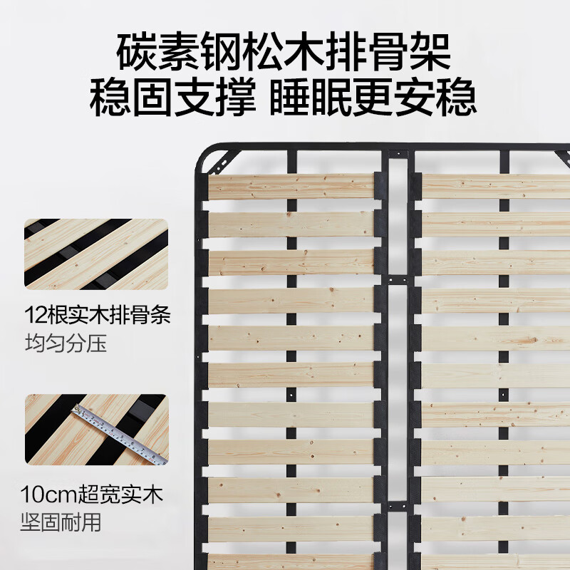 300kg高承重碳素钢,进口松木排骨架,选用高承重碳素钢+加密加厚实木,出色支撑,保护床垫,睡得踏实。