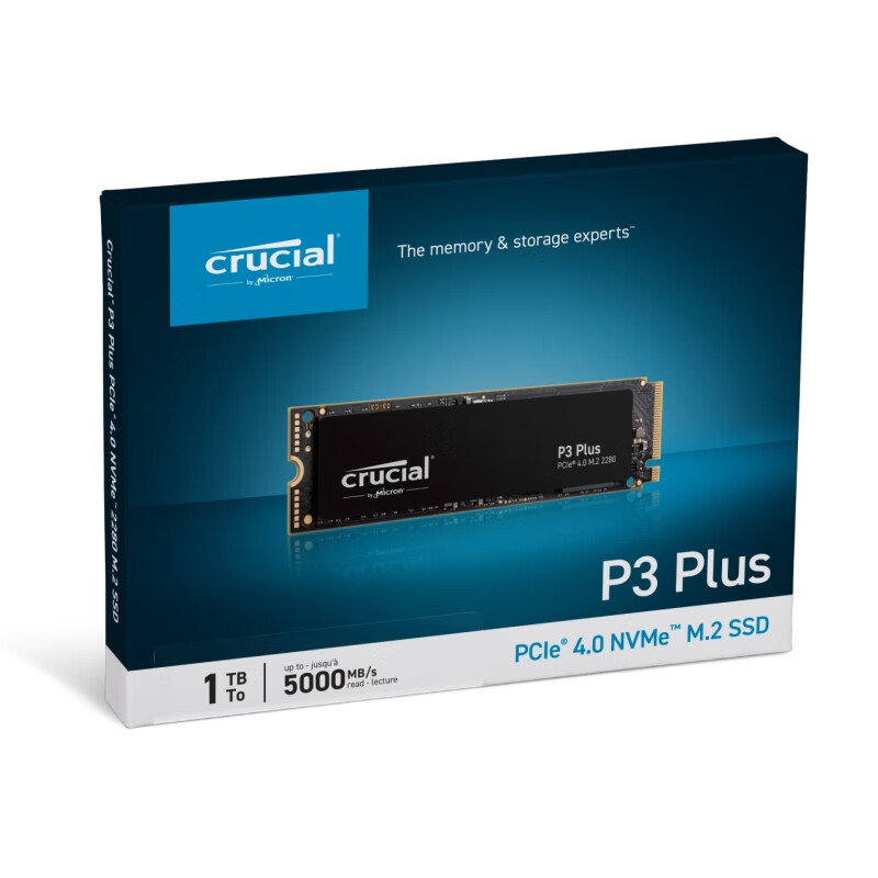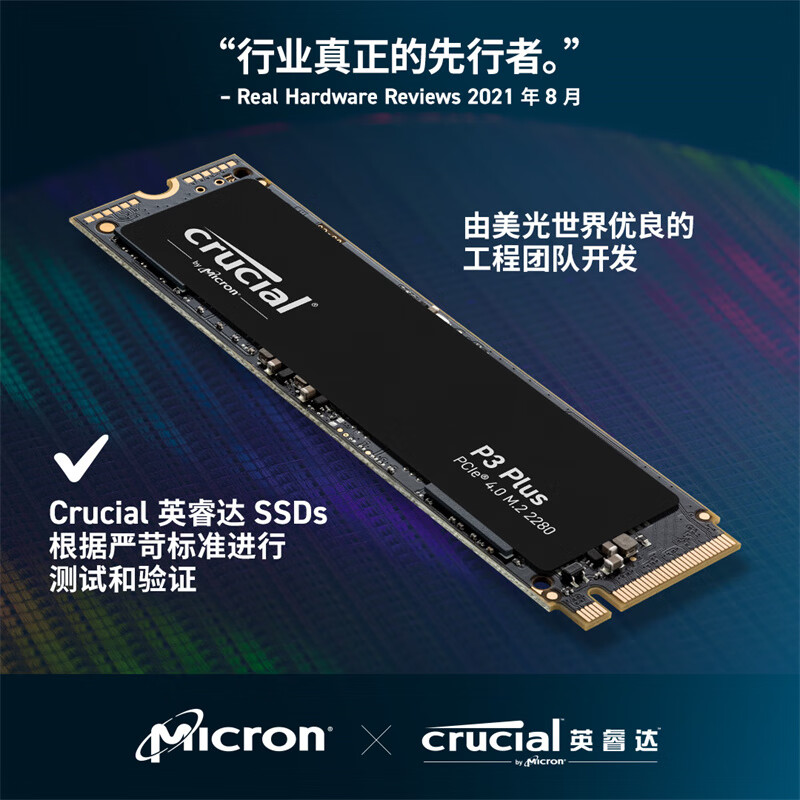 英睿达 P3 Plus系列固态硬盘由Micron美光设计,采用创新Gen4 NVMe 3D NAND技术,可向下兼容大部分Gen3系统,读取速度高达5000MB/s,写入速度高达3600MB/s。拥有全驱动加密能力、可实现性能优化的固态硬盘管理软件以及固件更新,和动态写入加速、自适应热保护功能以增强数据安全并提高系统可靠性,强大的Gen4存储能力,提供500GB、1TB、2TB、4TB容量可选。5年质保。