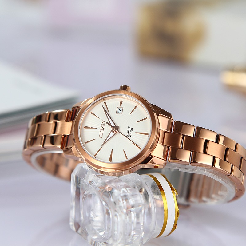 此款西铁城 EU6073-53A 女表选用矿物质强化玻璃表镜,不锈钢镀粉金色表盘及表壳,剑型时标,经典大三针,夜光涂层,3点钟方向日历开窗,搭配石英机芯,表盘直径28mm, 厚度8mm,防水5Bar。