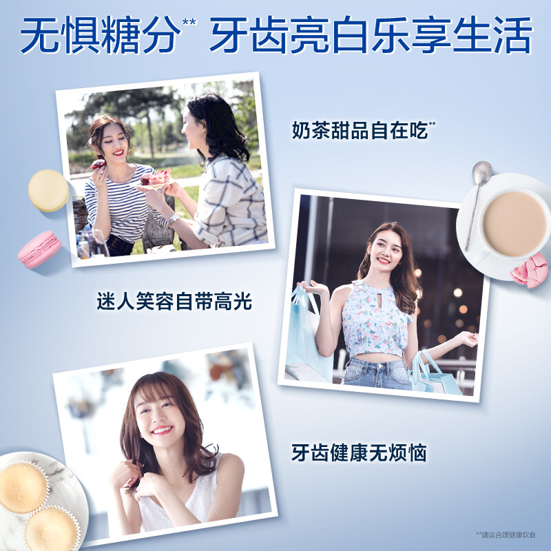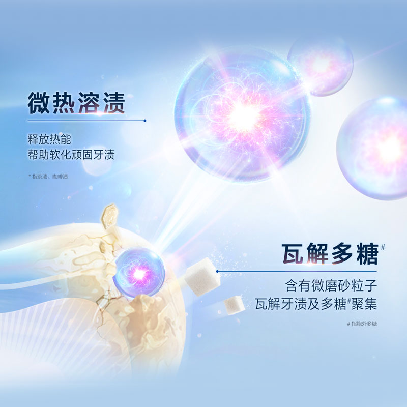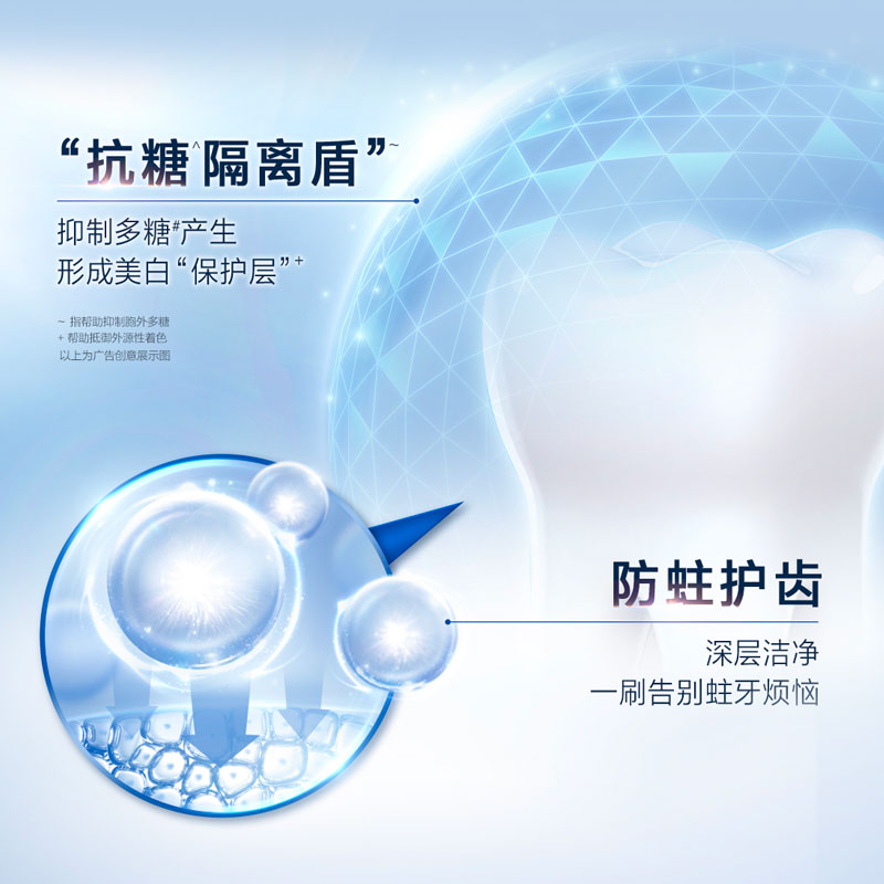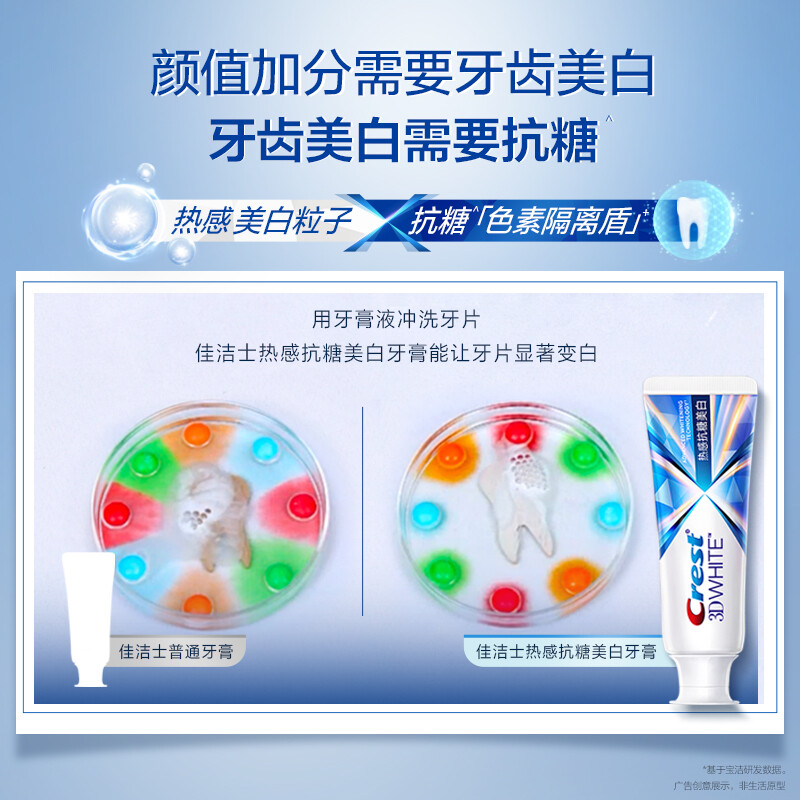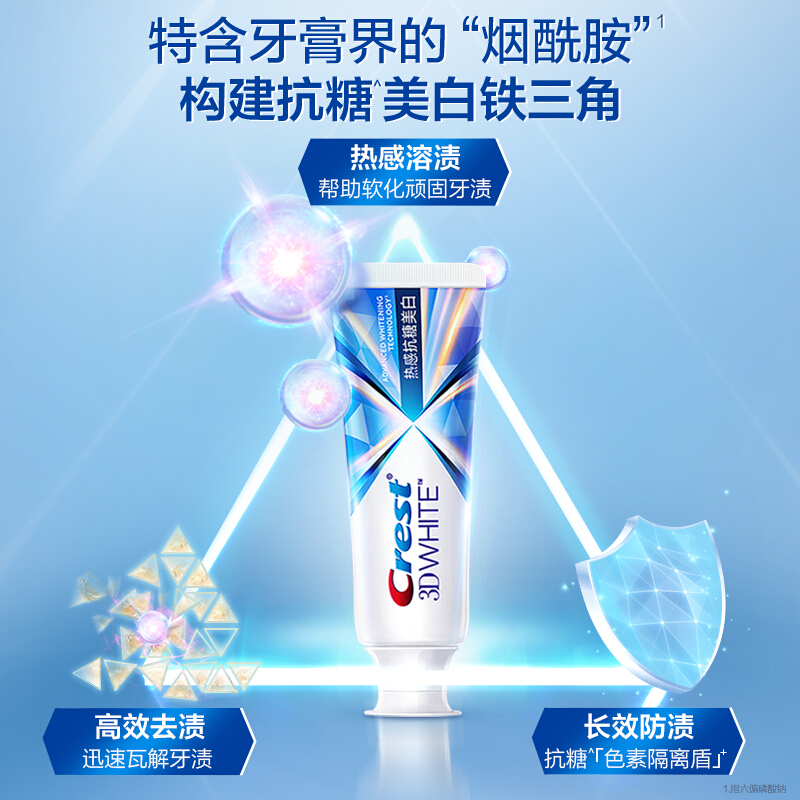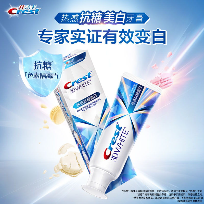 Crest 佳洁士推出的这款3D钻亮炫白热感抗糖美白牙膏,含有微磨砂粒子,瓦解牙渍及多糖聚集,并抑制多糖的产生,在牙齿表面形成美白保护层。钻白膏体,泡沫丰盈,带有清新花果香,沁爽通透,清新口气。