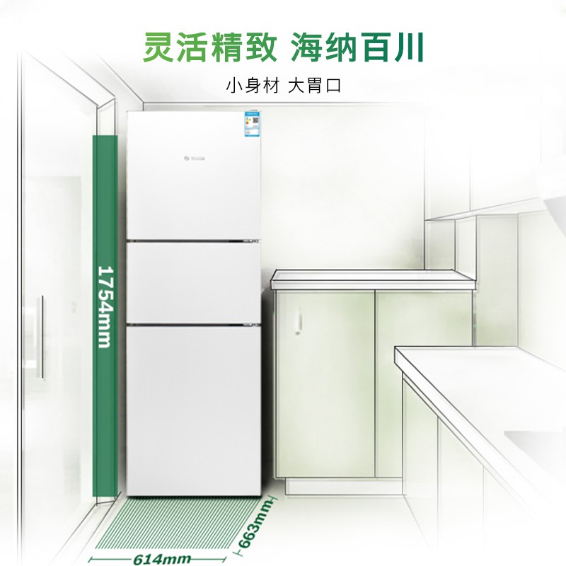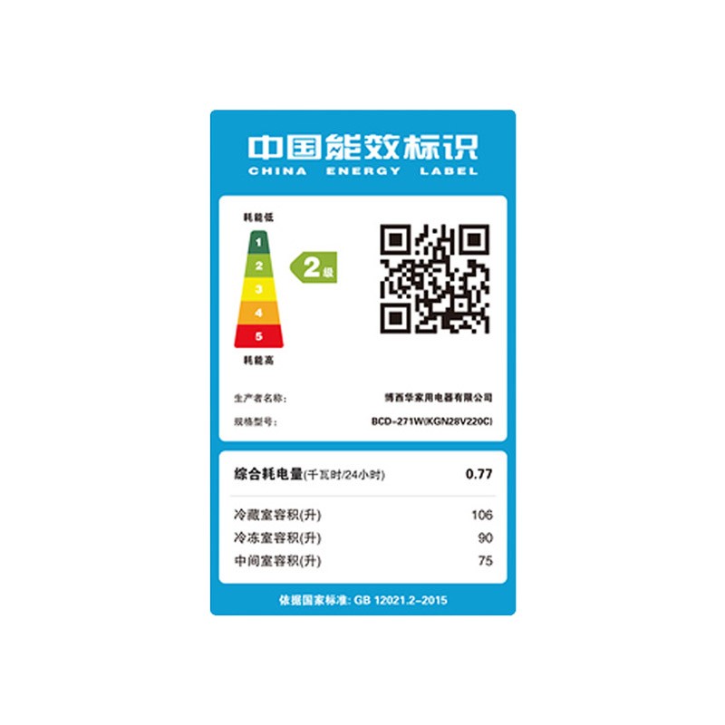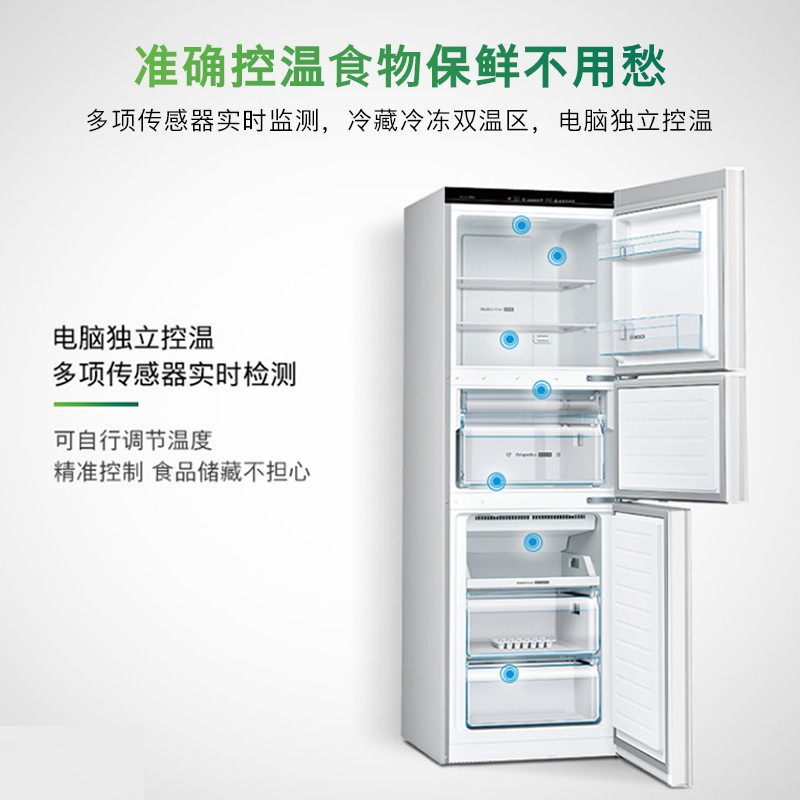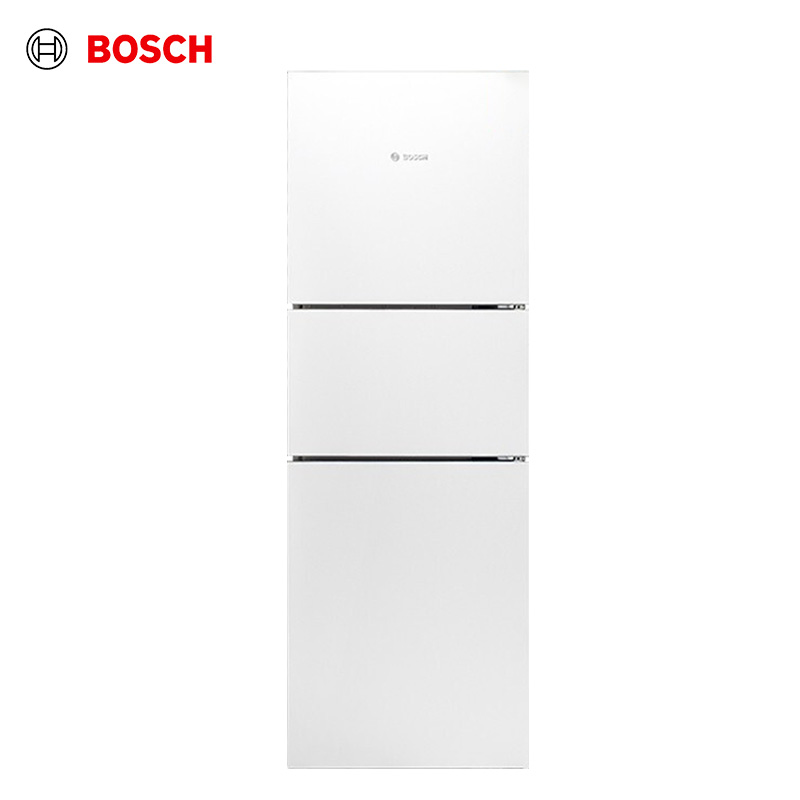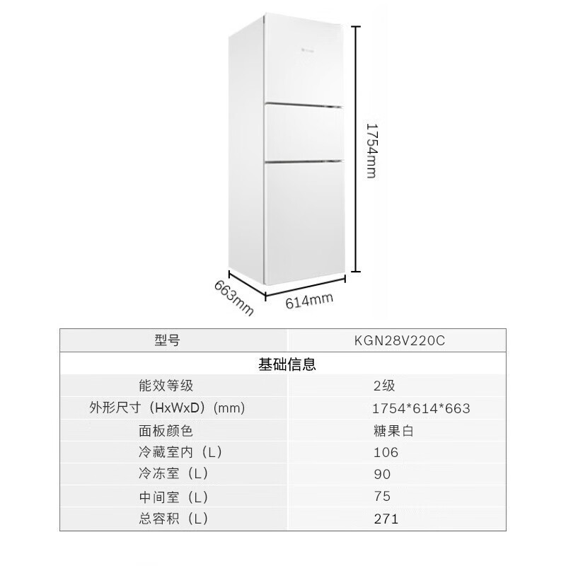 博世 KGN28V220C 三门冰箱,国家二级能效,0.77千瓦时/天。制冷方式为风冷,无需手动除霜。总容积271L,冷藏室容积106升, 冷冻室容积90升,中门容积75升。多维送风模式,升级冷藏室封路设计,温度均匀,冷冻室采用喷泉式出风,制冷效率更高。灵活分类储藏空间,置物隔板上下可调,瓶架高度可调整。糖果白金面板,外观简约,LED顶灯,照明更柔和,隐藏式门把手设计。产品尺寸1754*614*663mm。