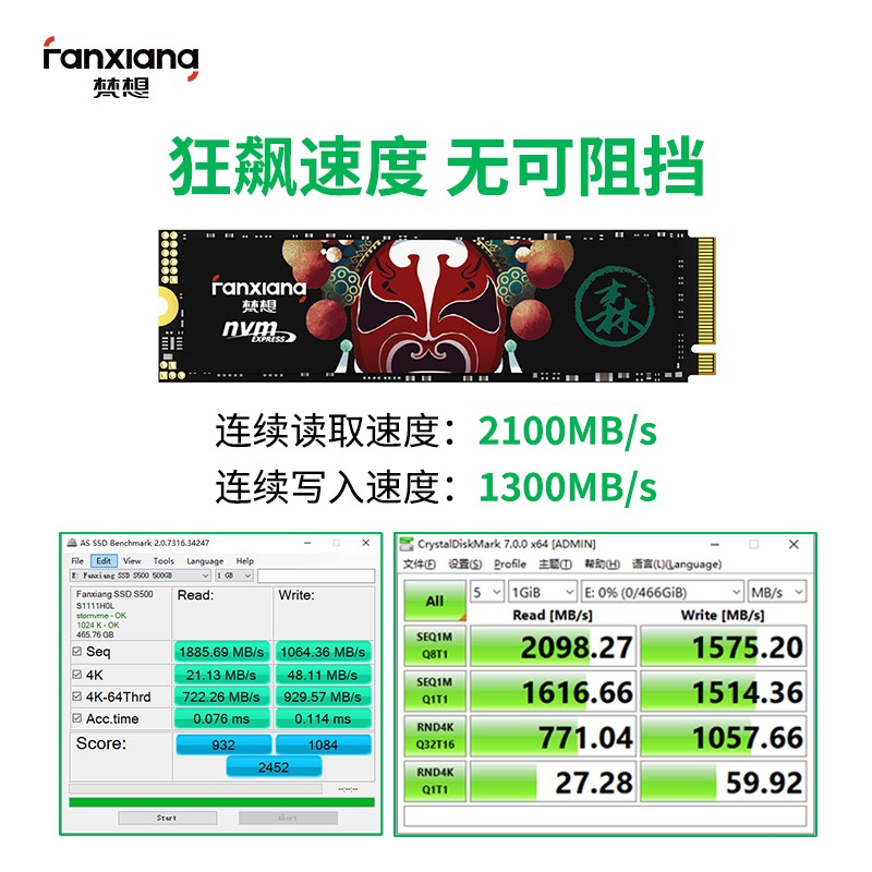 符合NVMe 1.3高速协议,读写速度可达2100MB/s、1800MB/s,S500在散热片中増加了石墨烯*涂层,为高性能固态硬盘提供有效的散热控制,使硬盘能持久且可靠的工作运行。精选原厂3 D NAND颗粒,确保产品的使用寿命与稳定性。
