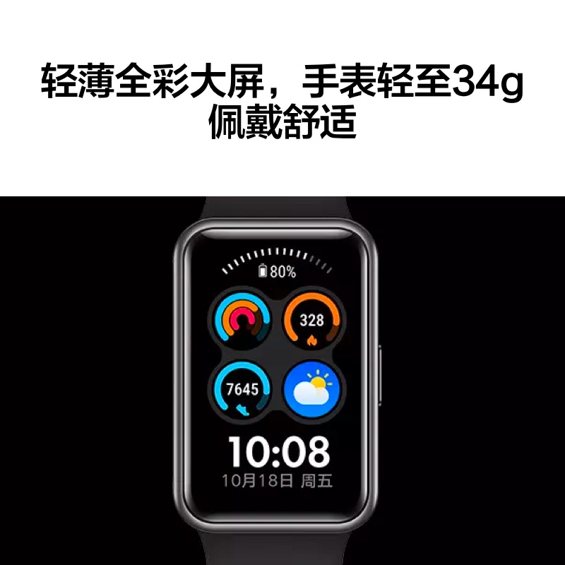 此款华为 Watch Fit new 智能手表采用窄方形1.64英寸2.5D弧形玻璃屏幕,280*456分辨率,70%屏占比下拥有高达326的PPI,有西柚红、樱花粉、薄荷绿、海岛蓝、蜜瓜橙5种配色。具有超过300个丰富表盘可供切换,满足个性百变的风格。手表轻至34g,侃戴轻盈舒适。典型使用场景下续航长达10天,重度使用场景下续航长达7天,更有华为快充技术加持,充电5分钟,可使用一整天。