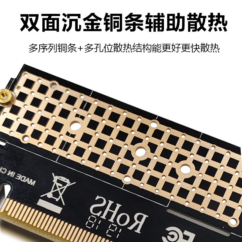 外观上采用全铝设计,不割手,做工比较精细。全铝外壳的另一个作用就是帮助散热,并且转接卡采用双面沉金铜条辅助散热,多序列铜条+多孔位散吉构能更好的在SSD运行中帮助其更快的散热,维持SSD的高效稳定运行。