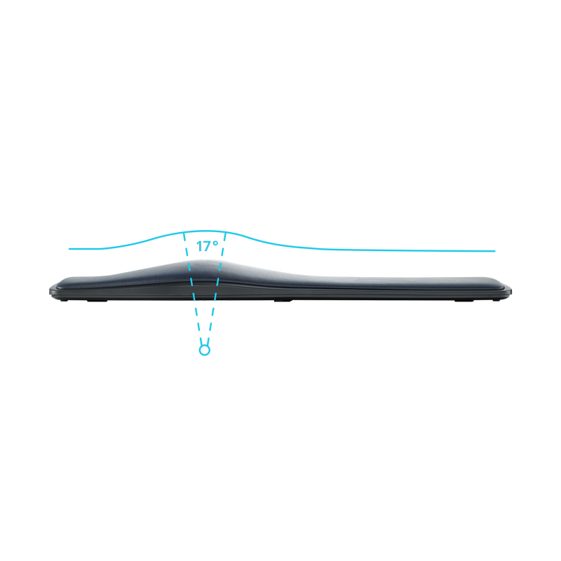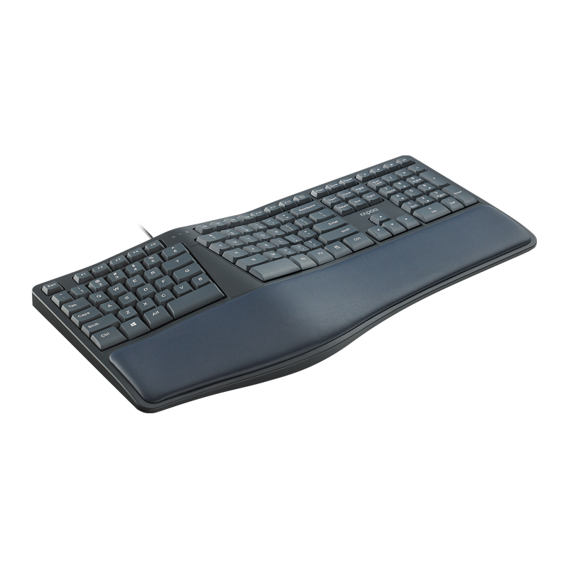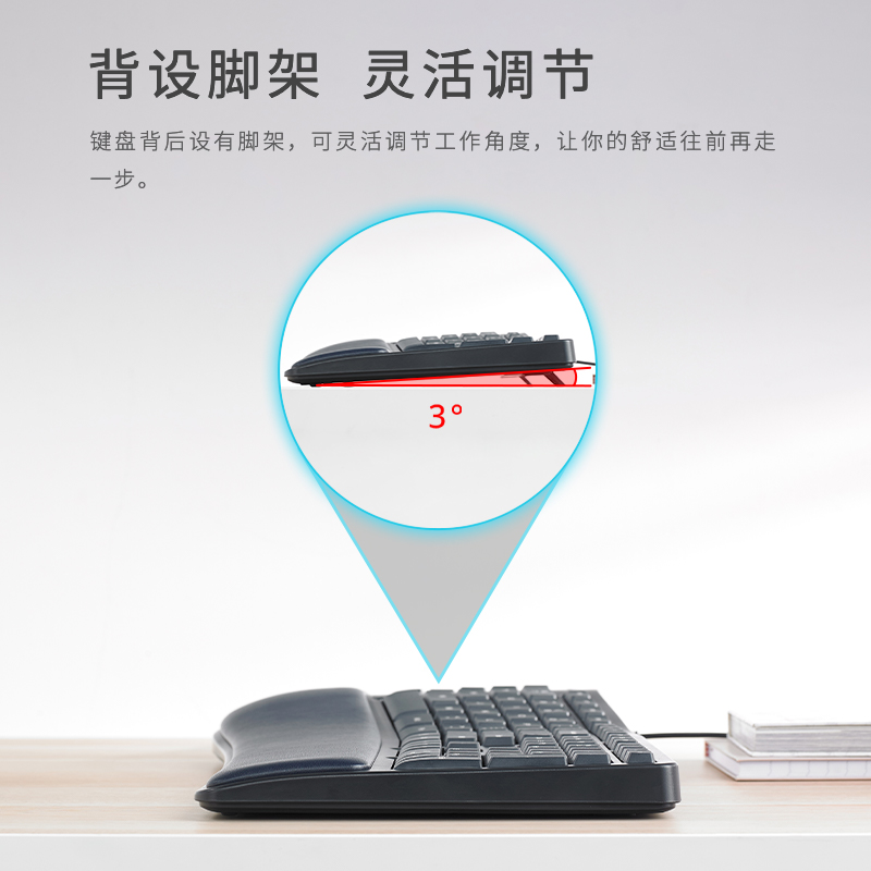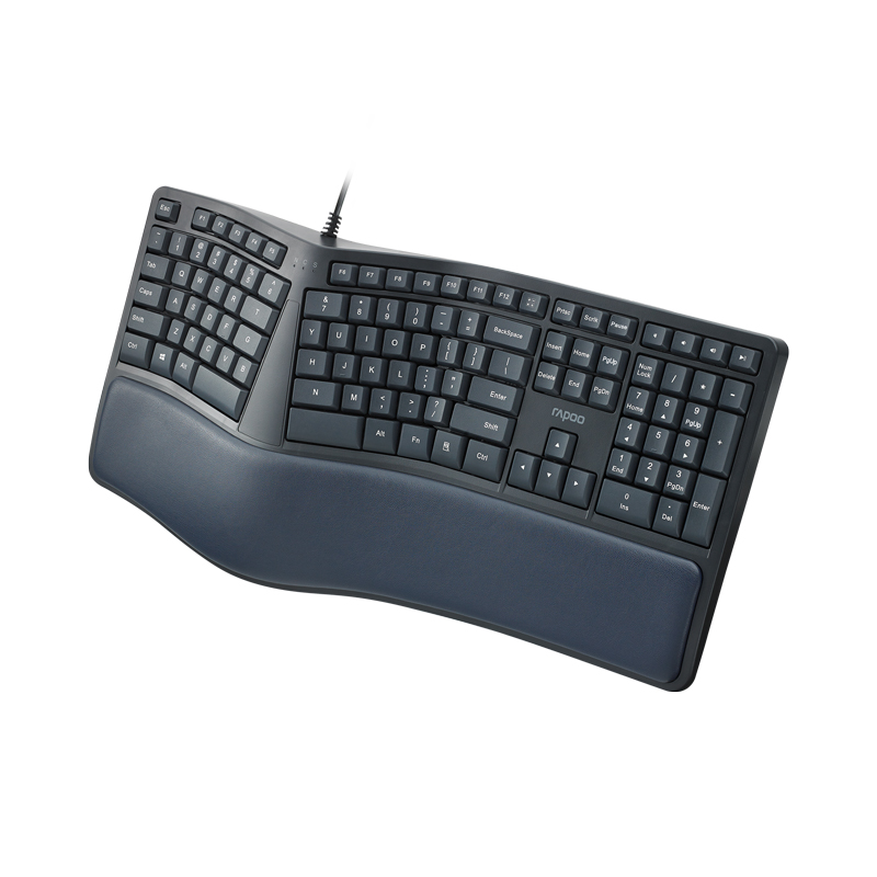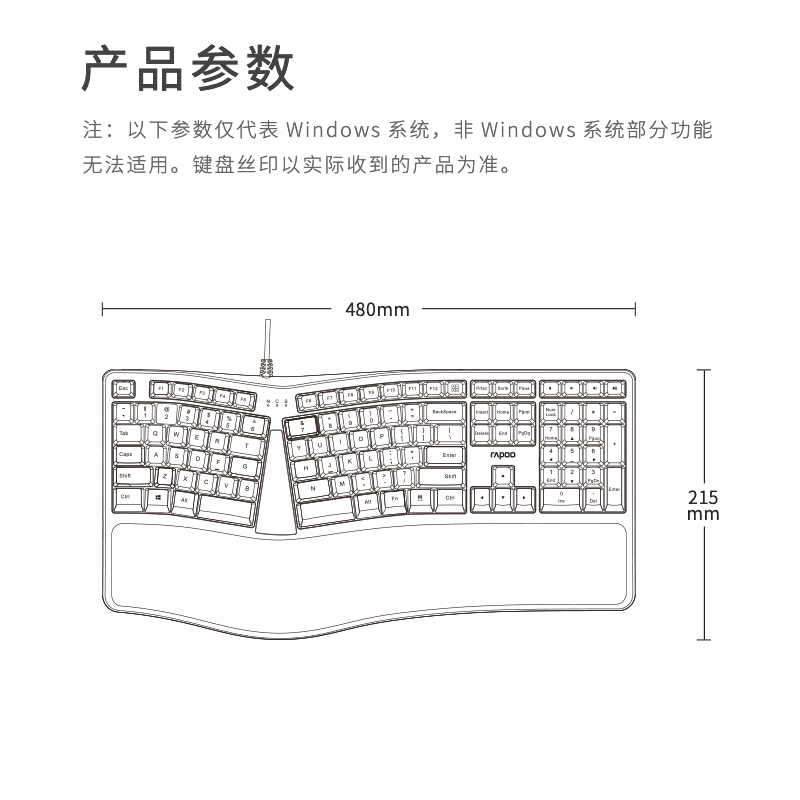 产品尺寸480*215*47mm,产品重量约945g,键盘采用分体式设计布局,键盘模拟指尖弯曲弧度的按键,配合依据手腕自然垂落的姿势进行按键布局,减少手指和手腕劳损,自然的弧形软垫掌托,使手腕始终停留在舒适的位置,手臂自然伸展,长时间码字者的贴心助手,键盘背后设有脚架,可灵活调节工作角度,按键字符印刷采用镭雕技术,耐磨耐用,按键行程0.5±0.2。