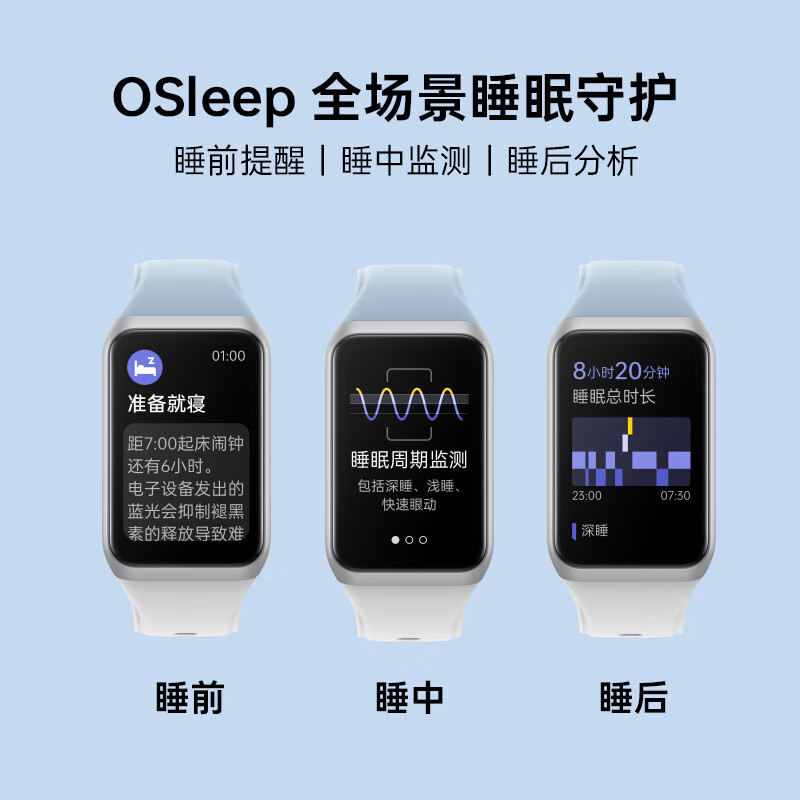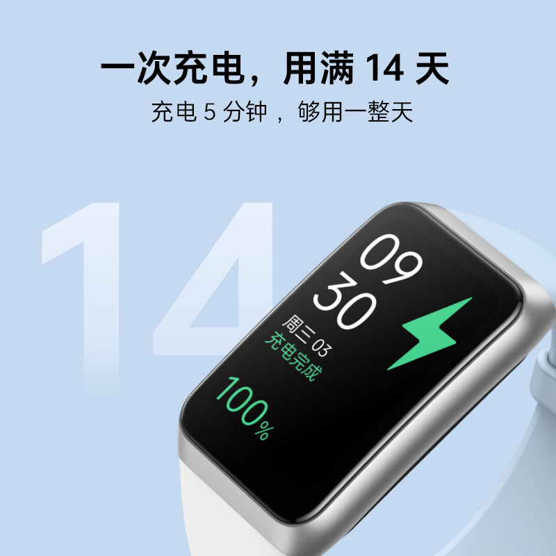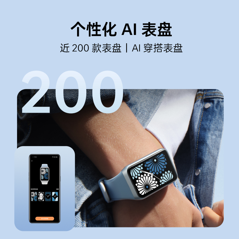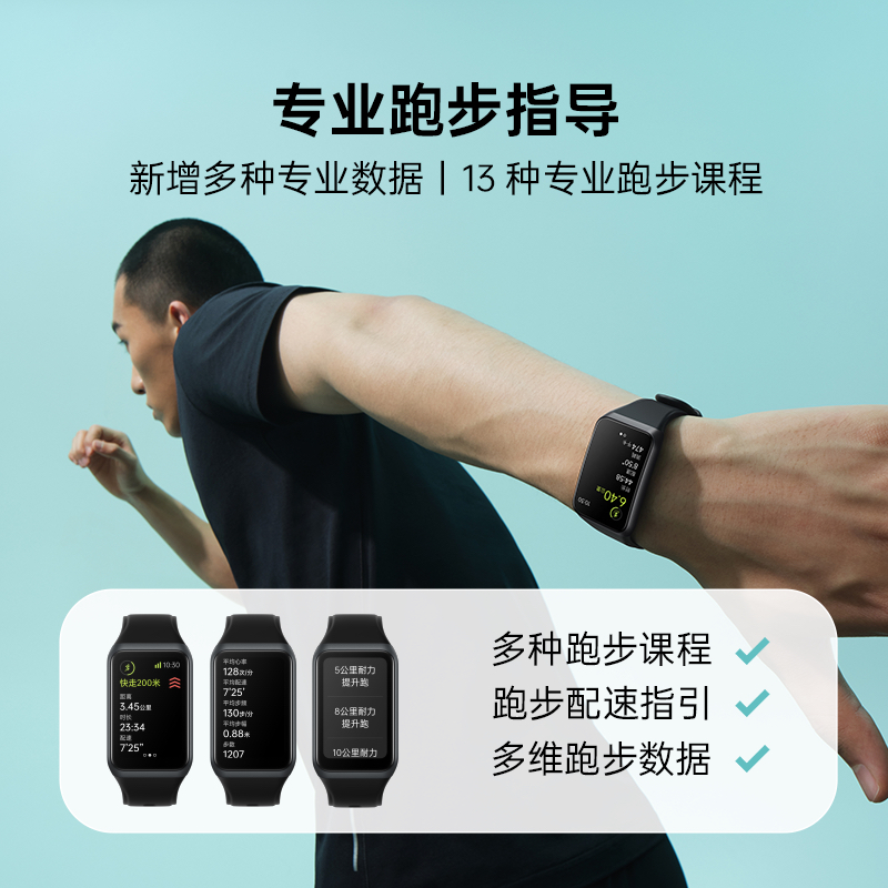 手环厚11.4mm,整机重33g,硅胶表带,暗夜黑、晴云蓝 2 款配色,仅200款表盘可更换。正面采用一块1.57 英寸 256×402 AMOLED 屏幕,2.5D玻璃盖板,302PPI、500nit亮度,100%DCI-P3色域,内置 200mAh 电池,磁吸式充电,60分钟即可充满,支持24小时不规则心率监测、连续血氧、实时压力监测,支持跑步心率守护、网球模式,全场景睡眠守护,蓝牙 5.0,支持 5ATM 防水。使用手机导航,手环能实时显示地图关键信息,内置电竞模式,支持游戏心率记录,起飞/复活提醒。