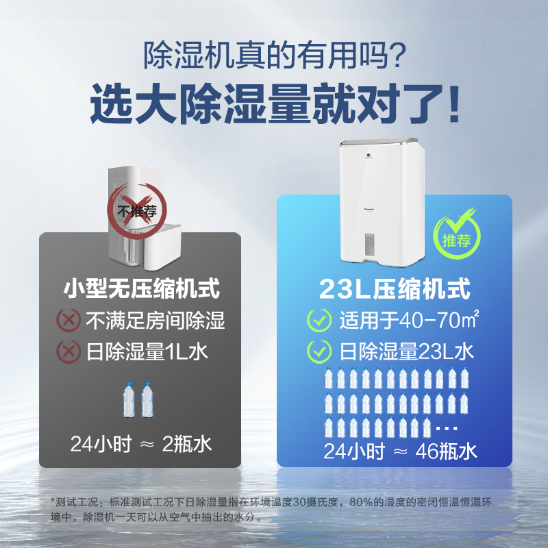 松下 F-46C7YXW 除湿机采用W-HEXS双重除湿系统,新增多层式除湿膜,增大气流进风方向,扩大接触面积,除湿量为23~29L/D,节省电能达29%。nanoe纳米水离子净化每秒释放4800亿个氢氧根离子,同时可以净化空气,有效除菌、脱臭、分解PM2.5。ECONAVI智慧干衣通过侦测空气温湿度来判断衣服干燥情况,调整除湿档位。5.2L大容量可视水箱,减少倒水次数,水位一目了然
