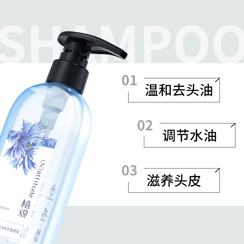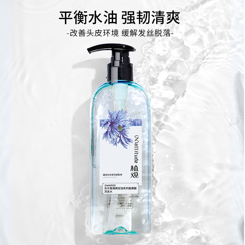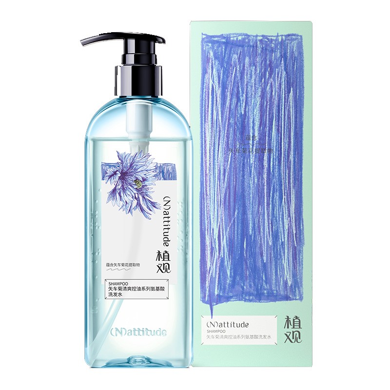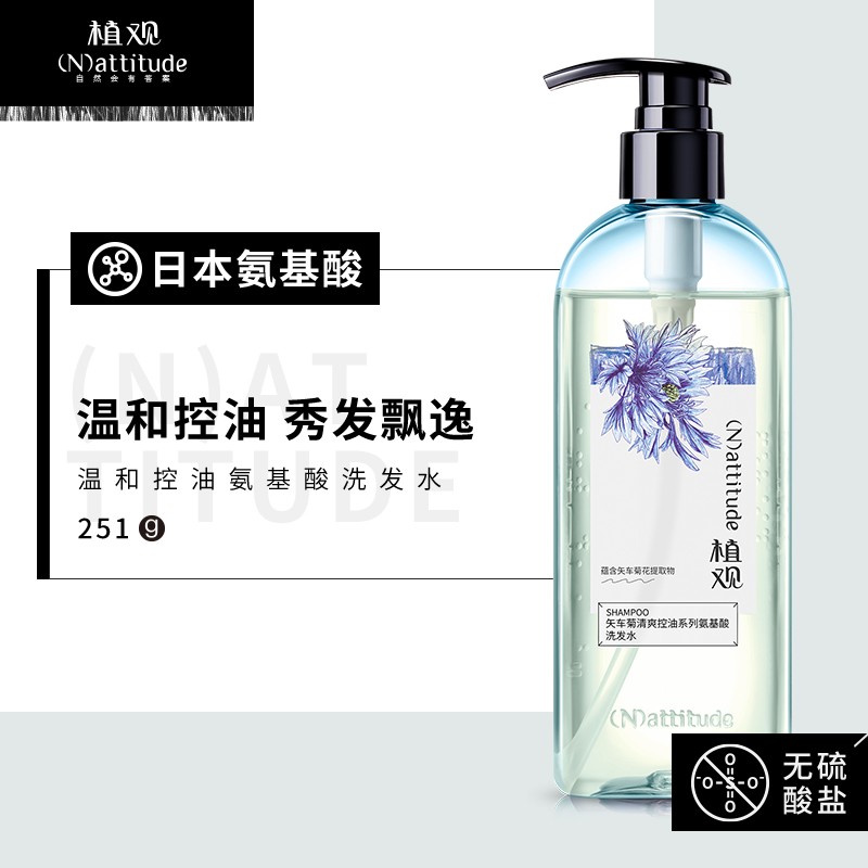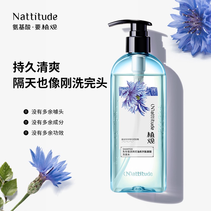植观(NATTITUDE)推出的这款洗发水,添加氨基酸、矢车菊植物提取物、保湿剂与定型剂等成分,帮助清洁头皮多余油脂,改善头发干枯毛躁、易脱落等问题,为头皮补充营养与水分,调节水油平衡,令头发清爽柔顺。透明质地,泡沫细腻,并带有清新香味。