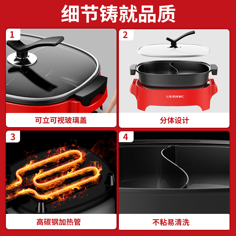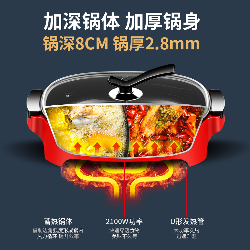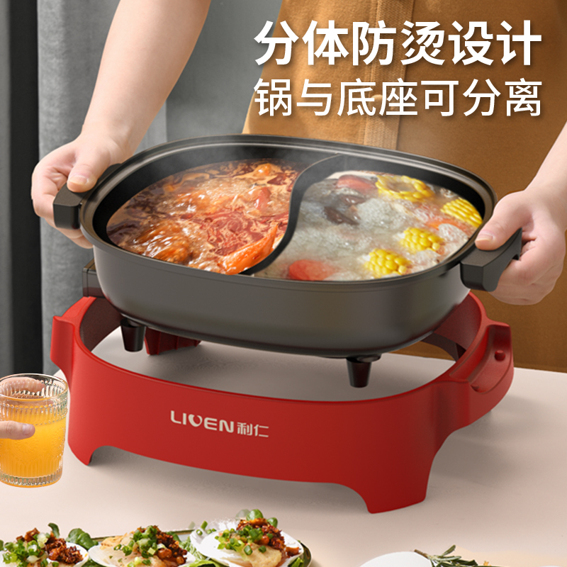 利仁这款两味鸳鸯锅,2100W大功率,升温快,火力足。蓄热锅体,增强蓄热效果,使食物受热更均匀。搭载U形发热管,大功率发热,促进锅内热力循环。三档火力可调,火锅可拆分体设计,清洗方便。宽间距防烫手柄,防止烫伤,提握方便。