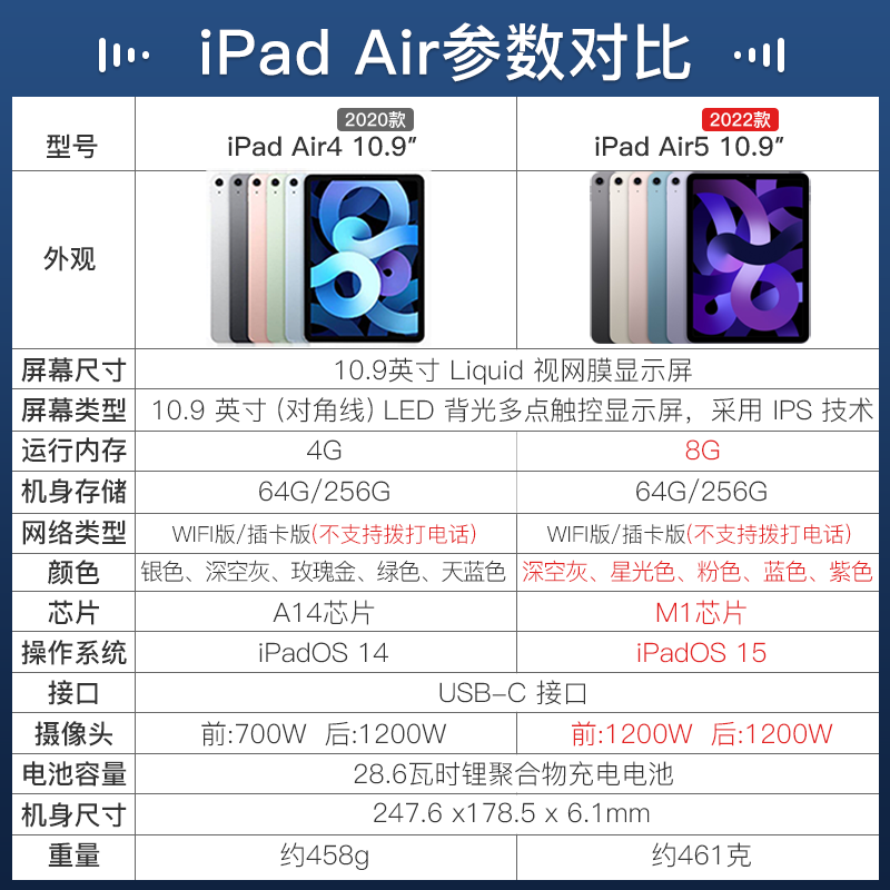 性能方面,搭载 M1 芯片的 iPad Air 5 CPU 性能提升 60%,图形性能达到上代的 2 倍。 前置摄像头也做了升级 iPad Air 5 搭载了 12MP 相机,支持 Center Stage 功能。首发共有64GB和256GB可选。连接性方面, iPad Air 5 可选 5G 蜂窝数据版本。