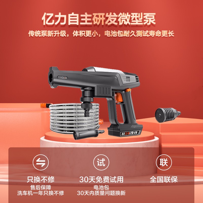亿力品牌创建于1983年,专注清洁行业32年。专业从事高压清洗机、吸尘器的研发、设计、制造和销售,一直致力于成为全球一流的清洁器具供应商。本款亿力永恒之枪便携式洗车机采用自主研发微型泵,额定功率40W,24.6bar水压,2000mAh大容量电池,L档可续航40分钟。