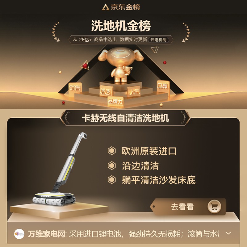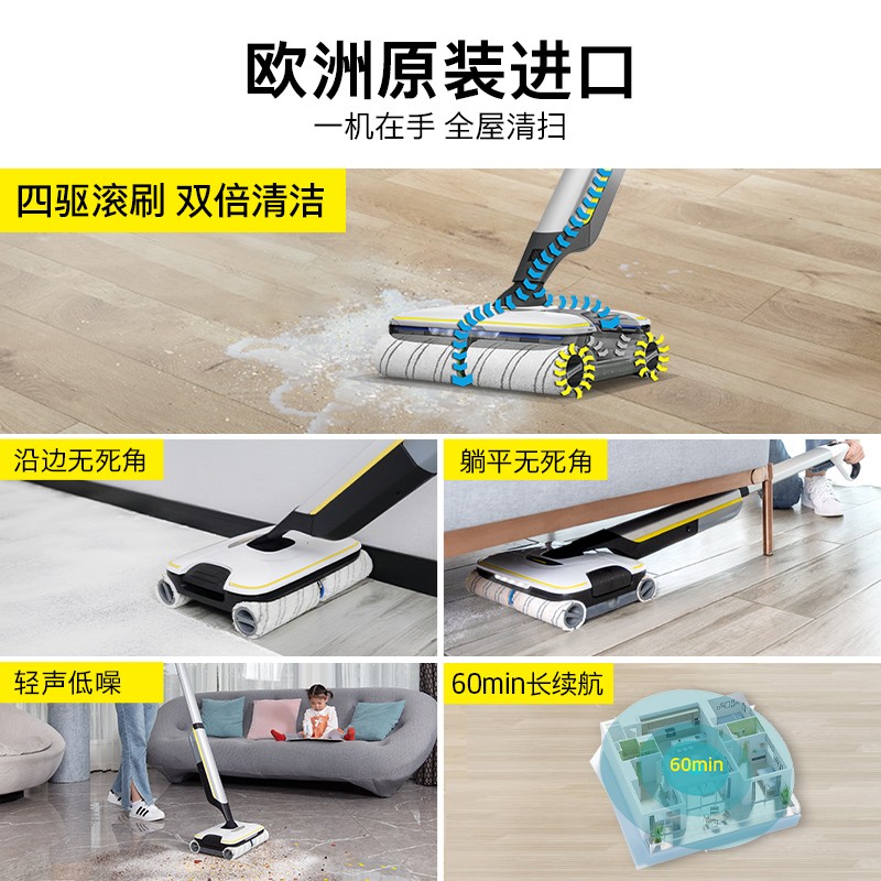 卡赫FC7洗地机,采用低重心设计,手感更为轻盈,整机可以轻松躺平,方便深入沙发、橱柜、矮凳下方的低矮空间;采用中心驱动技术,有别于两侧驱动,让滚刷两侧无遮挡;内置7节锂电池,低档运行时长超过60分钟;3重智能自清洁,包括滚刷毛发自洁、清水自洁和清洁站自洁;配备两类滚刷,包括适用于木地板、瓷砖和大理石的通用滚刷,以及适用于粗糙石砖的石材滚刷;机器前方配备宽域LED灯,暗处工作也能一目了然。