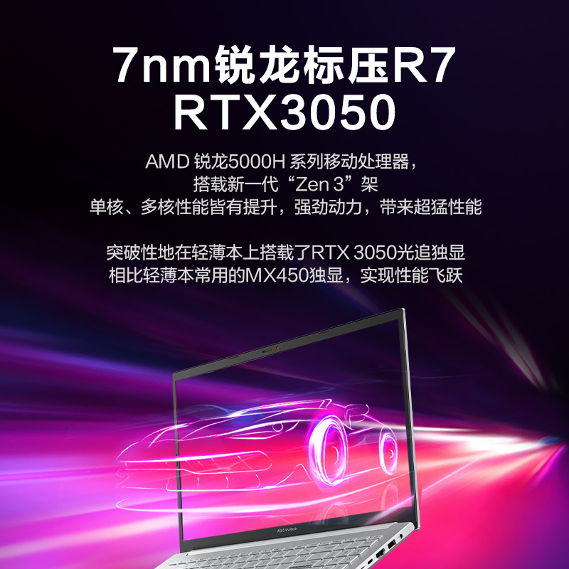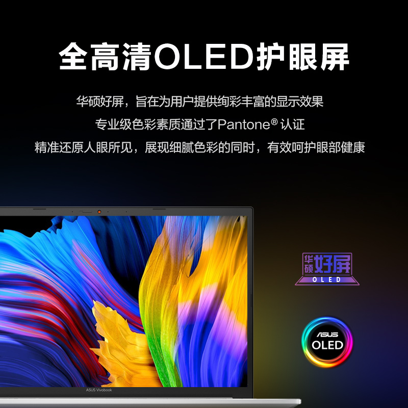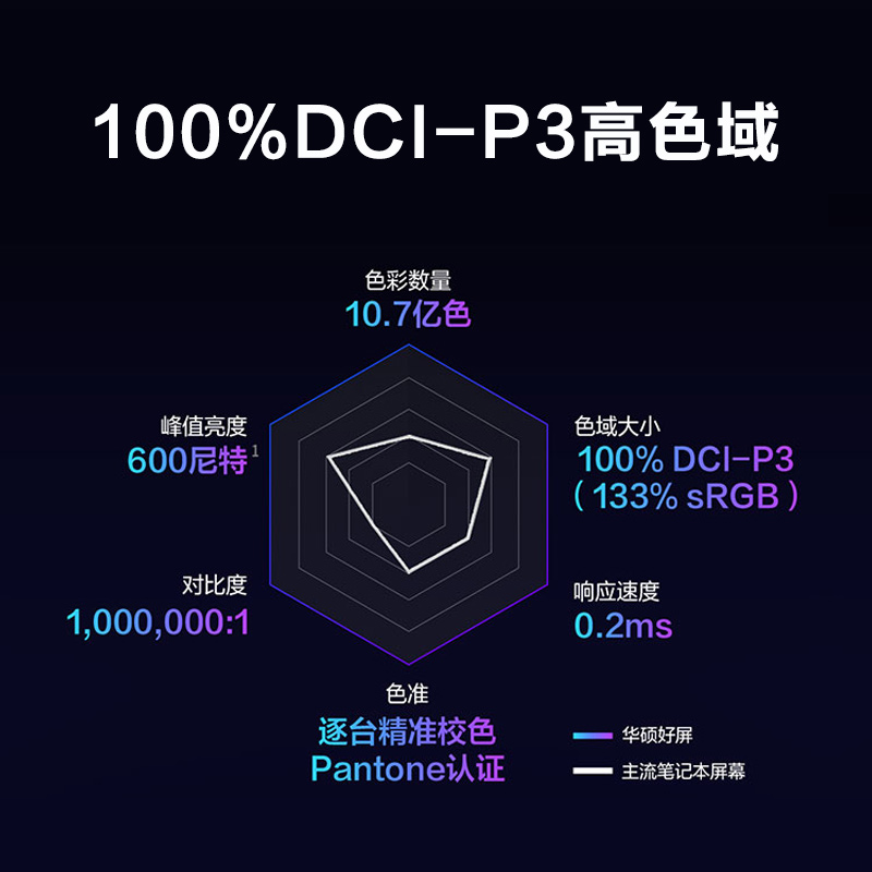 华硕 无畏Pro15 锐龙版 15.6英寸笔记本电脑屏幕方面,采用OLED屏,新一代E4发光材质。100%DCl-P3广色域,1000000:1超高对比度,10.7亿色彩,通过新 DISPLAYHDR True Black600 认证,支持DC调光。