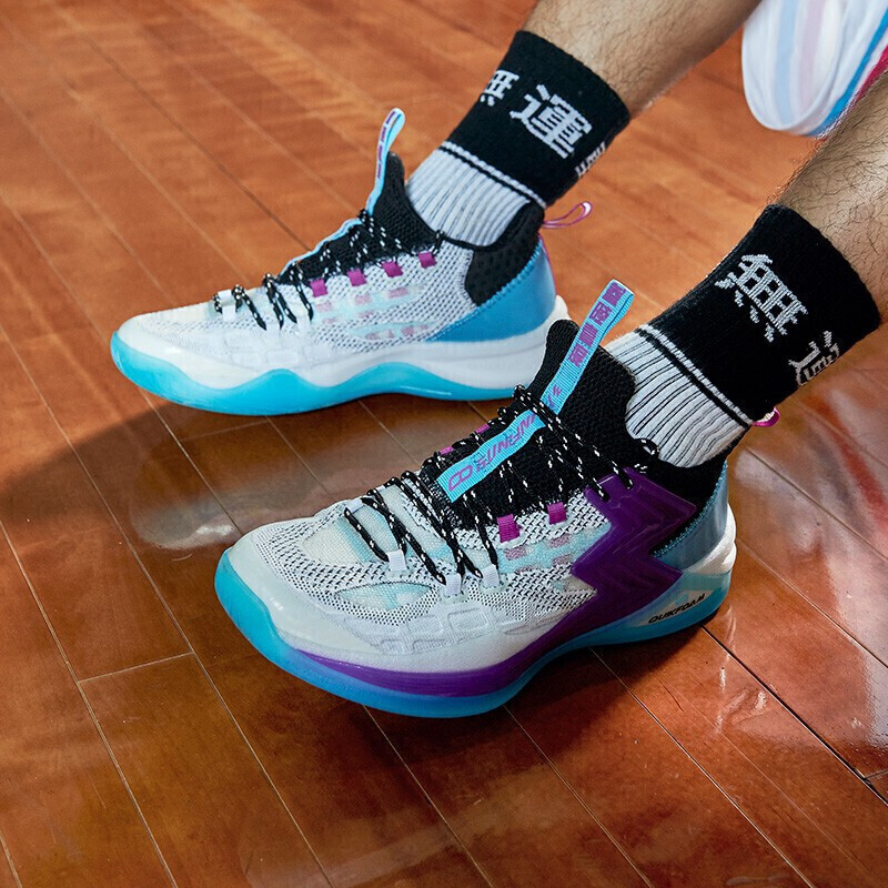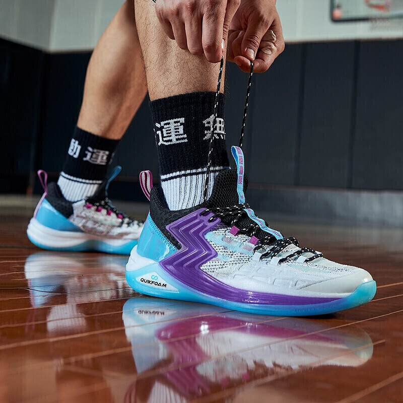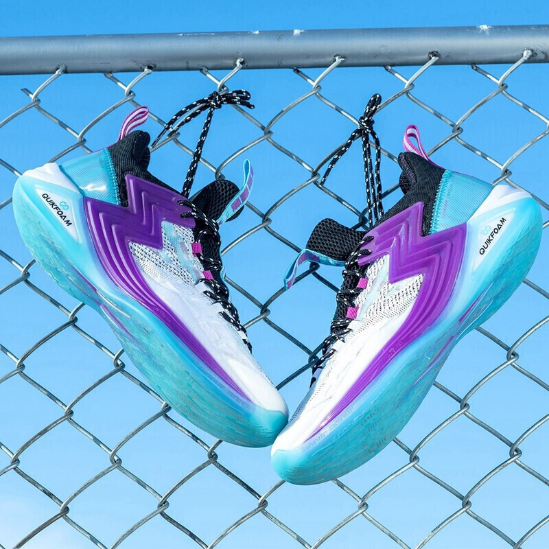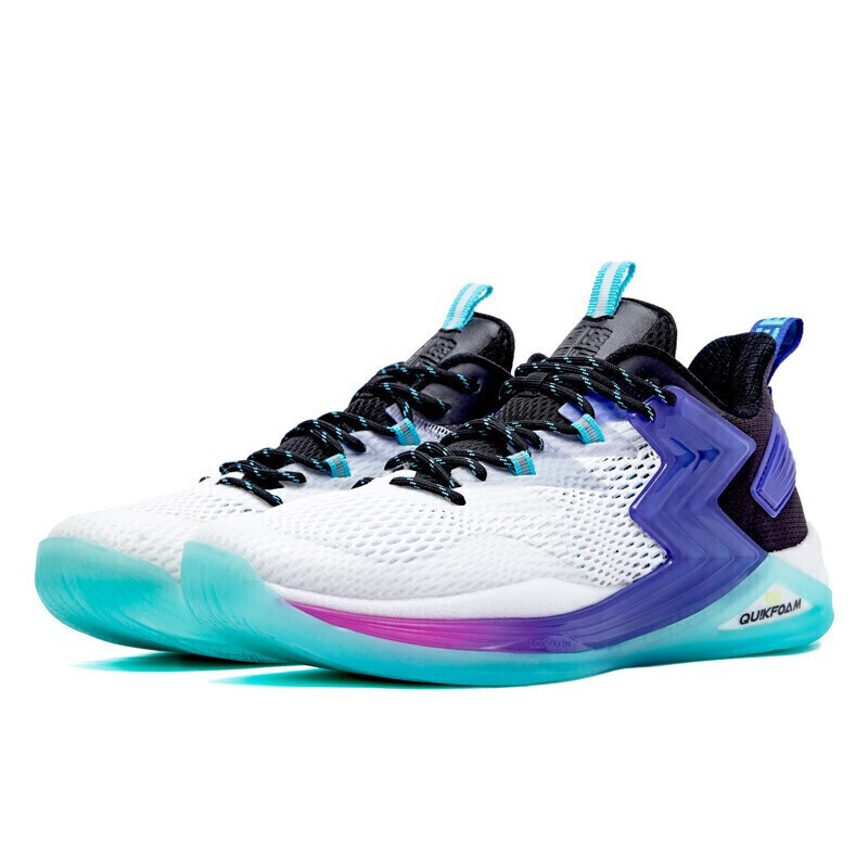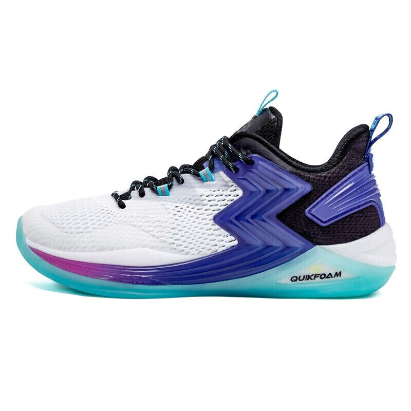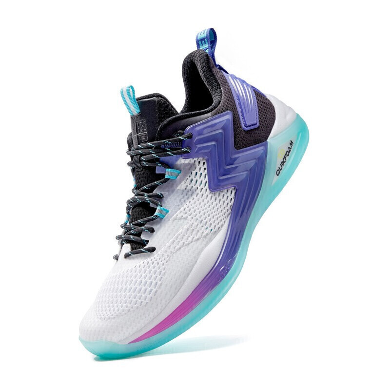 361°Q弹减震防滑篮球鞋阿隆·戈登全明星扣篮大赛战靴,鞋子的邦面采用针织结合tpu网纱包裹性强的同时还具有舒适透气,鞋面笼式结构加强鞋身各方位的支撑与包裹同时兼具轻量化与透气性。TPU全覆盖地面一体搭载渐变“3"logo展现"多一度热爱"的品牌文化同时提供侧向有效支撑,Q弹科技中底具有大力回弹、缓震、耐皱,强力爆发保护关节。鞋底TPU结构源自仿生人体足底筋膜灵感设计有效保护足弓,全掌的橡胶大底防侧翻361°Q弹减震防滑篮球鞋白/奇幻紫配色,鞋面渐变的针织和鞋侧身处采用渐变“3"logo展现,灵感源自于利福尼亚的日落。