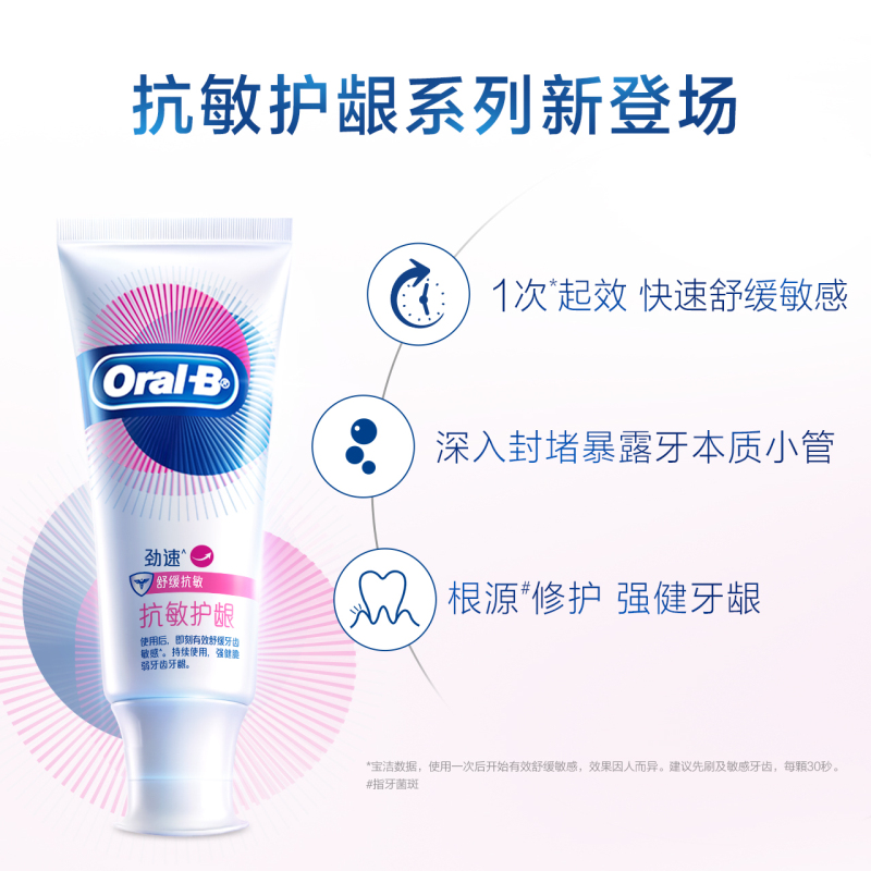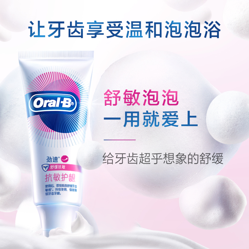 Oral-B欧乐-B泡泡牙膏中的这款抗敏护龈系列,是一款多效修护抗敏的牙膏,针对牙齿敏感,快速舒缓突发的刺痛,特含专业的口腔护理成分亚锡,扎实封堵暴露的牙本质小管,从而改善牙齿敏感。同时延续该系列对牙龈的呵护,丰富的泡泡让刷感更舒适,刷完口腔更有清爽的感觉。
