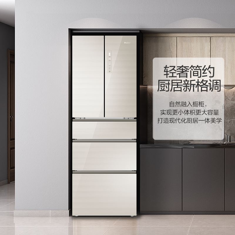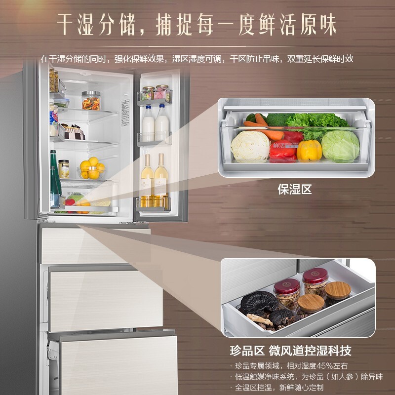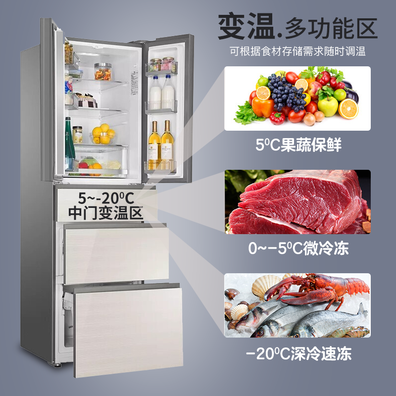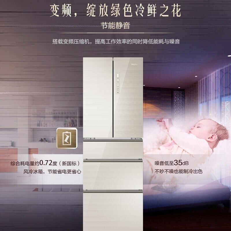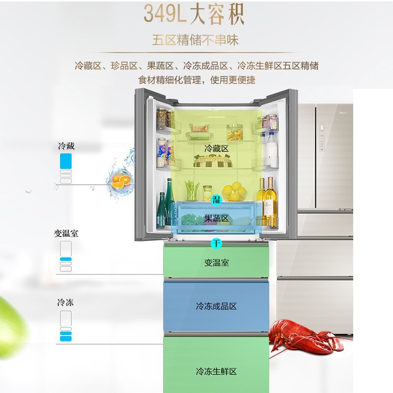 海尔 BCD-349WDCV 变频风冷五门冰箱,干湿分储,一级能效,一共349L,冷冻室 118L,变温室35L,冷藏室196L,5°一20℃宽幅大变温室可根据食材储存要求随需调温,通过碧玺石释放DEO因子天然净味保持箱内空气清新,变频压缩机加变频风机提高效率的同时降低能耗与噪音。
