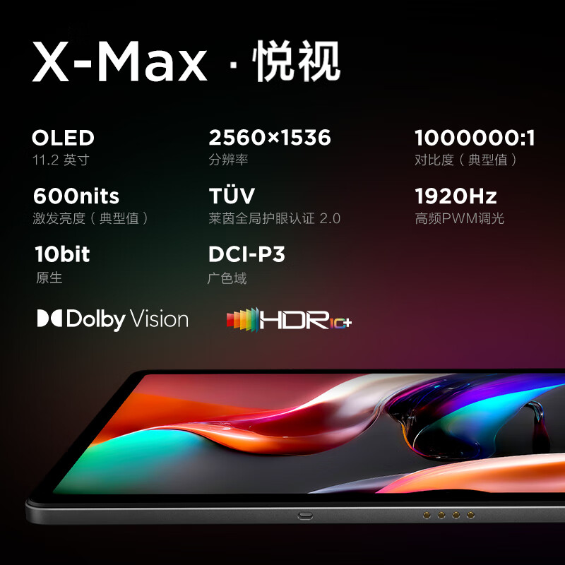 联想小新Pad Pro 2022 骁龙版采用了11.2英寸OLED屏,2560*1536 分辨率,120Hz 刷新率,峰值亮度600尼特,1920Hz高频PWM调光,骁龙版还支持面部指纹双解锁,10bit 原生。