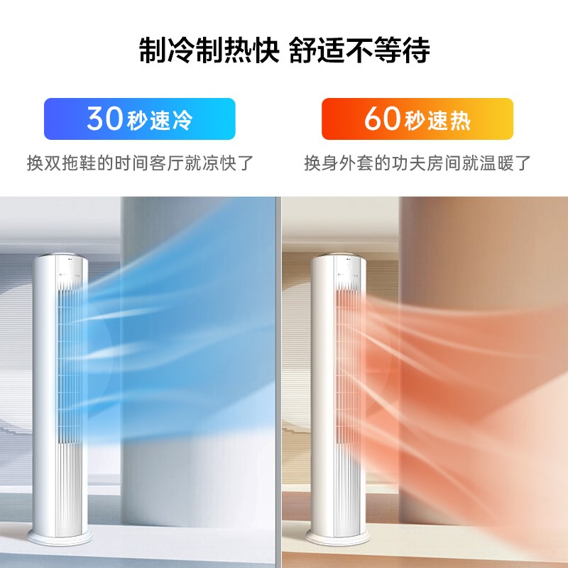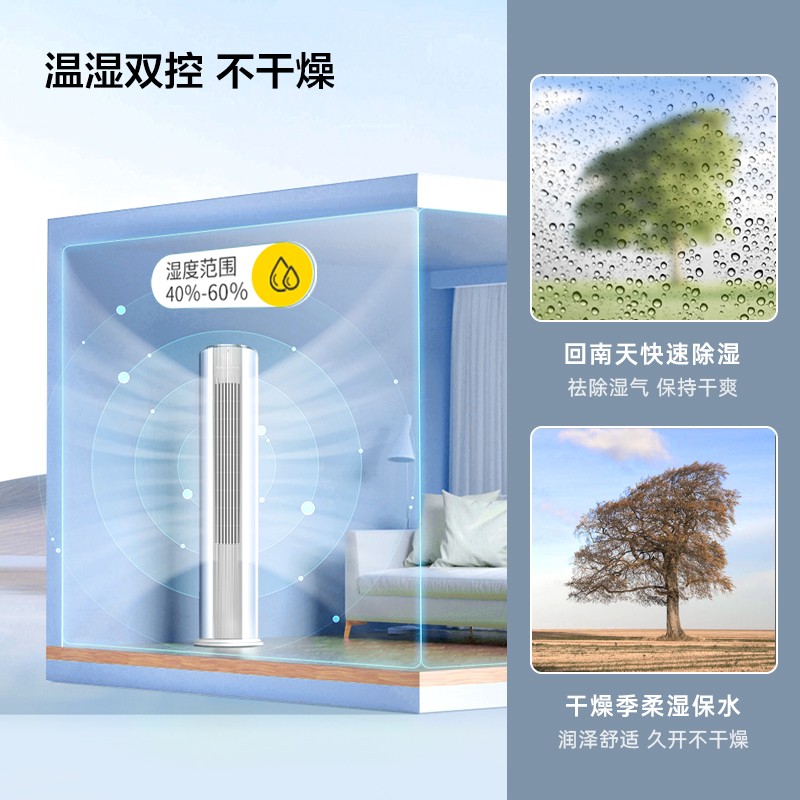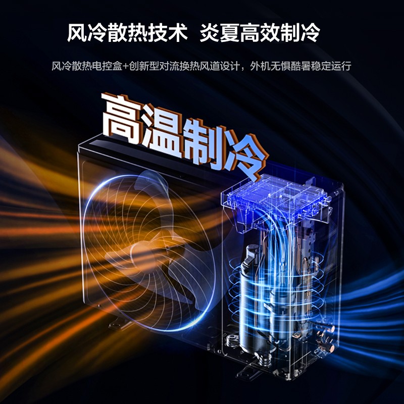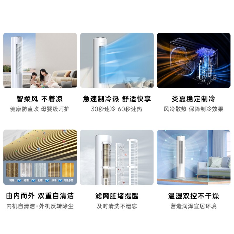 采用特设柔风微孔设计,密集分布于叶片上打散气流,输送更贴近自然风的绵柔气流,提供更舒适温和的体验;带有智慧健康柔风功能,带来柔风吹着体验,防止冷风直吹,避免宝宝着凉;立体送风设计,高达72种送风角度组合,想吹哪里吹哪里,满足你多角度的吹风需求;搭载高温除菌自清洁功能,采用科学烘干技术,蒸发器四大步骤高温杀菌自清洁,保证在凉爽的同时还能畅享呼吸,后期清洁维护更省心,更来更加健康的使用体验;采用高频启动技术,开机后迅速高频率运行实现更快的制冷制热效果,给你更及时的舒适响应,制冷制热不等待;智能控湿设计,可感知周围环境,控制湿度范围40%-60%,使屋内空气环境始终处于润泽舒适的状态,防止出现久吹干燥的情况;外机采用专利风冷散热技术,保障空调在60℃高温下稳定制冷运行,即便是天气在热也能平稳运行。