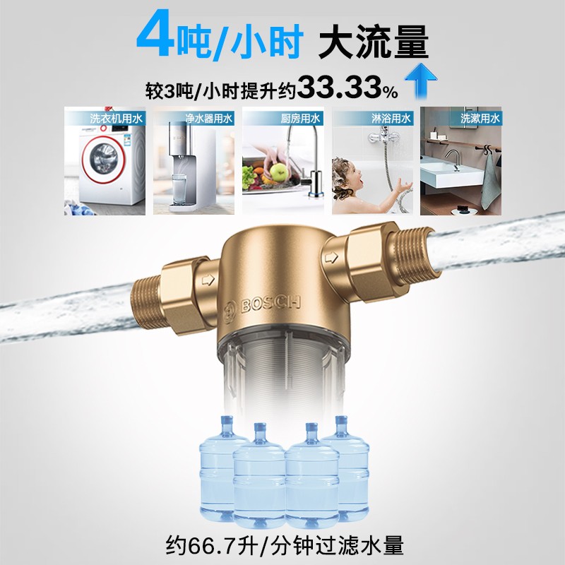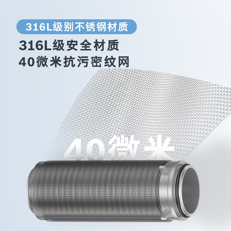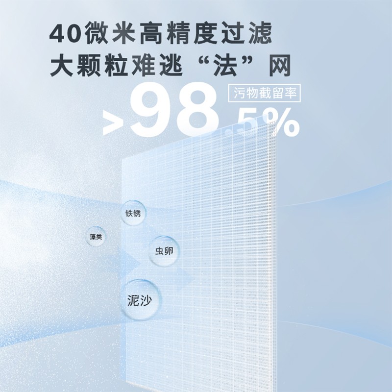 40微米高精度过滤,大颗粒难逃''法”网,污物截留率>98.5%,有效拦截水中的铁锈、泥沙、红虫等肉眼看不到的杂质,净水先一步,延长涉水家电使用寿命。