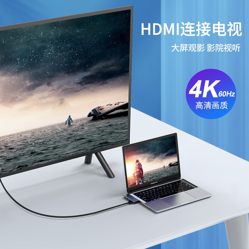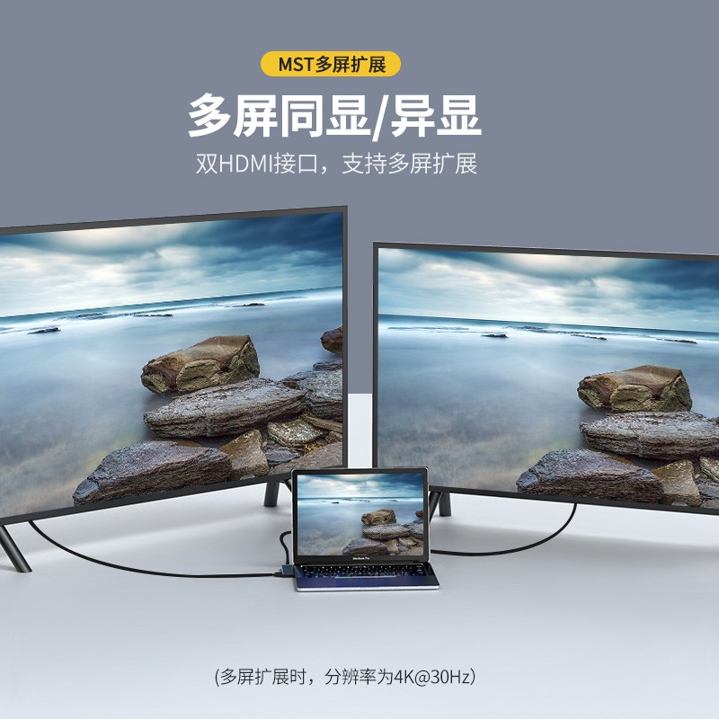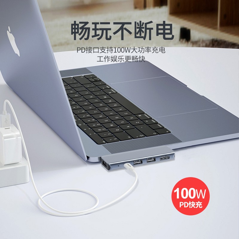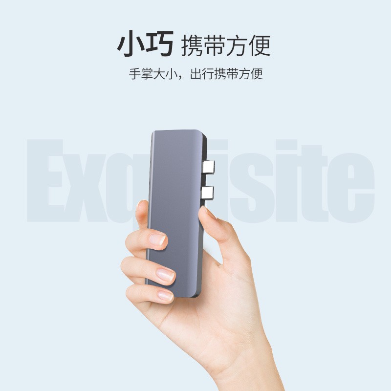 此款扩展坞为MacbookPro打造,支持4K60投屏输出,当同时输出2屏时,分辨率为4K30Hz。同时,PD支持100W快充,两个USB2.0。双插孔的贴合设计,在连接的时候达到紧密贴合,另外也适用新款的macbookair。