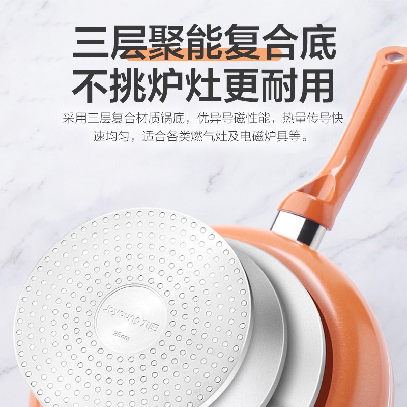 Joyoung 九阳 JLW2601D 不粘煎锅 珠光漆外壁,三层喷漆工艺,进口材质不掉漆,易清洗更耐磨。防烫胶木手柄,结实耐用,挂置便捷,收纳省心。加固铆钉设计,结实牢固。耐高温腐蚀,不易松动。三层聚能复合底设计,导热快速。适用于:电陶炉/电炉/电磁炉/卤素炉/煤气灶。980g超轻体验,随意翻炒。规格:26cm。