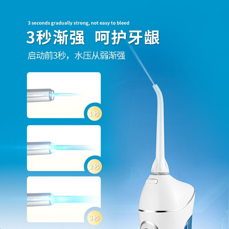 这款博皓的5025冲牙器,采用无线式设计,喷嘴可360°旋转。金属泵配合低压直流电路,长时间使用不升温。 四档冲洗模式、自定义模式8档水压可调,1400次/分钟高频率脉冲水柱,储水量200ml,全身水洗,IPX7防水等级,USB充电, 1400mah锂电池,两分钟定时关机,防止误按。可以有效清洗牙缝间及牙床难刷部位的细菌,按摩牙肉及有效预防牙龈炎, 饭后使用冲牙器一分钟可及时将牙缝里的食物残渣、软垢清除干净,减少剔牙和口腔异味。