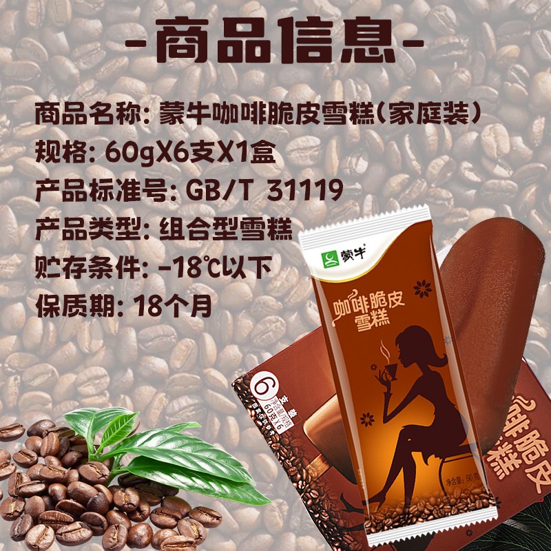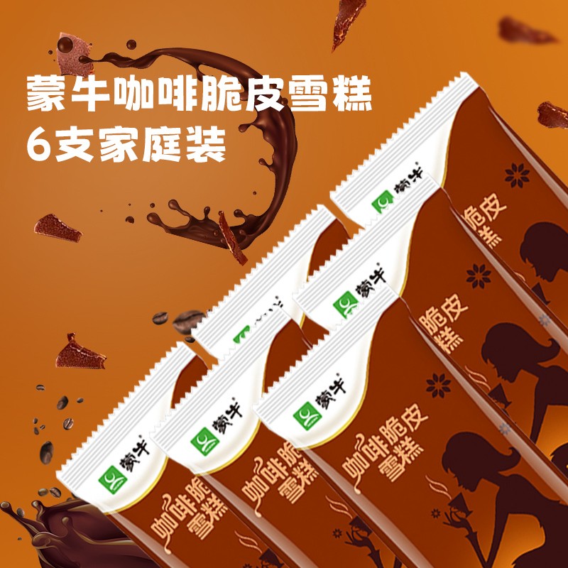 MENGNIU 蒙牛是蒙牛集团旗下主力品牌,于1999年成立,总部位于中国内蒙。蒙牛品牌主打液体奶、冰激凌和其他乳制品等产品。此款冰淇淋由香浓巧克力脆皮搭配醇香咖啡,入口香浓美味。规格:60g*6支。