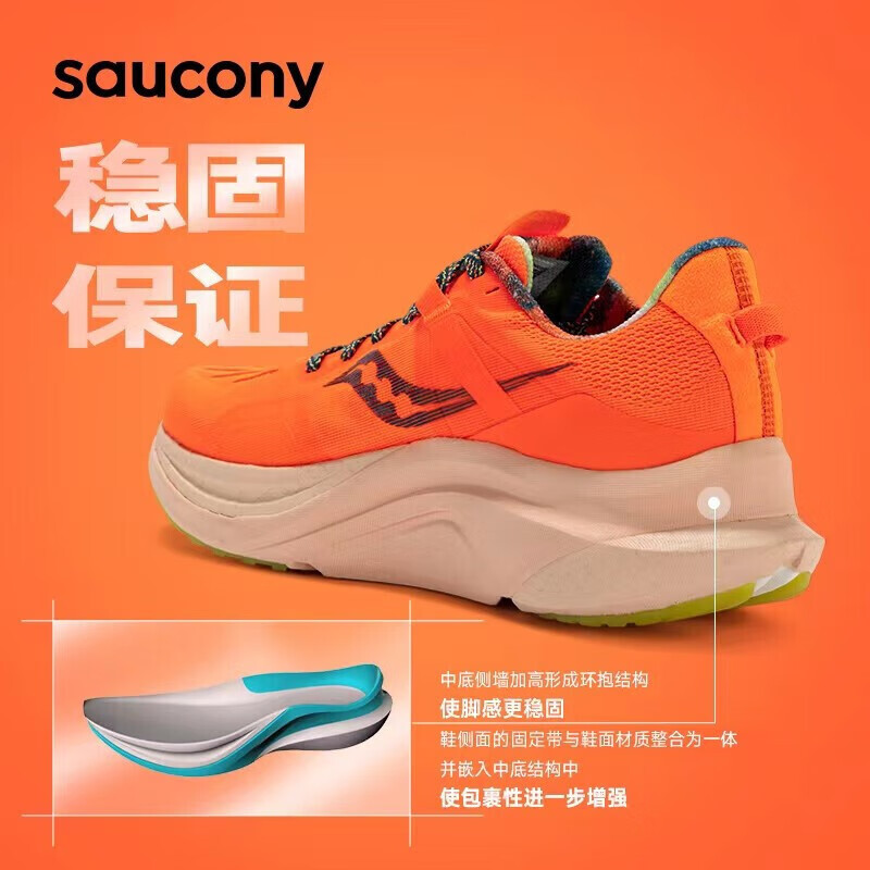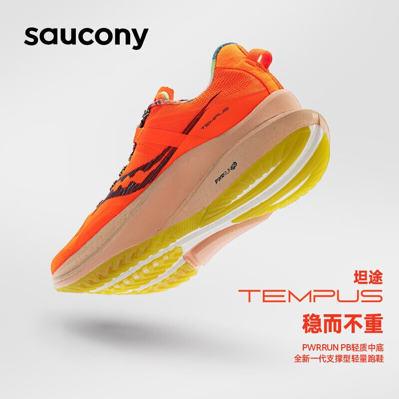 索康尼坦途作为索康尼首款轻量级别稳定支撑系跑鞋,解决了稳定系跑鞋长久以来的最大“痛点”——重,稳而不重,提供保护的同时,减轻了跑者的负担感,带你一路坦途。中底制作330度环绕框架支撑,主要集中在足弓和前掌,使步态更稳定舒畅,减少触底形变。填充使用了索康尼旗舰级的PWRRUN PB(空间支撑)+PWRRUN(空间承重)材料,双密度结构落地反馈感受更舒适。鞋身外观线条流畅,鞋头和鞋身侧墙有透气孔设计,夏季运动排汗散热都不错。