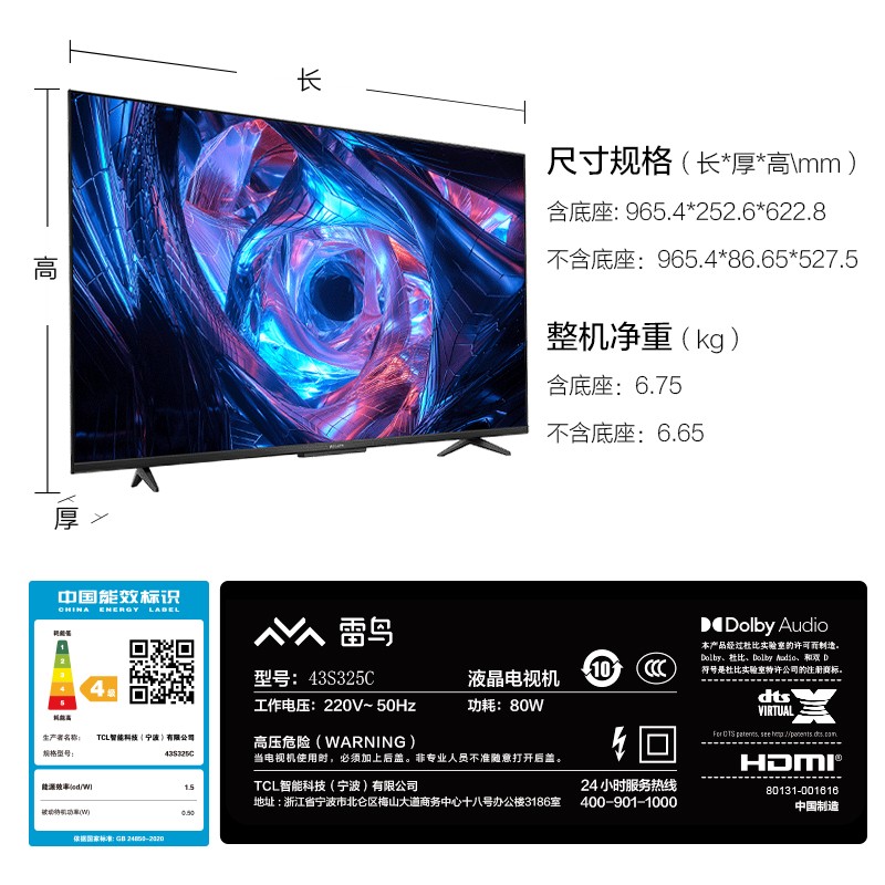 雀4PRO系列新品2022年3月上新,包括65英寸、55英寸、50英寸和43英寸四个尺寸版本,产品采用无边框全面屏设计、支持远场语音(免遥控),支持 HDR10、拥有杜比+DTS音效、搭载四核A55+G31架构T972处理器,2+16GB大内存、4K分辨率;