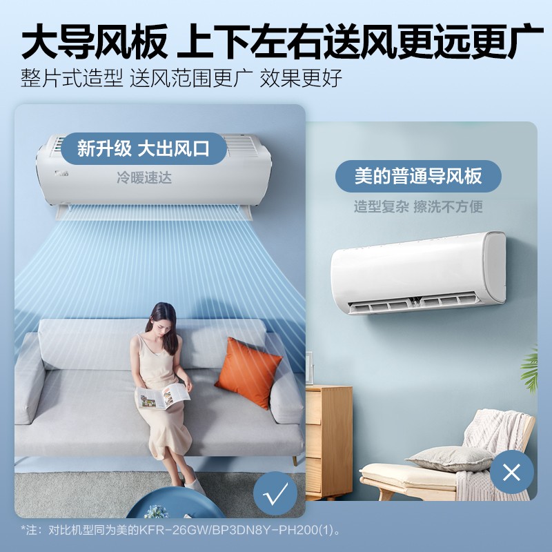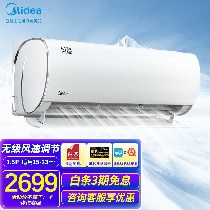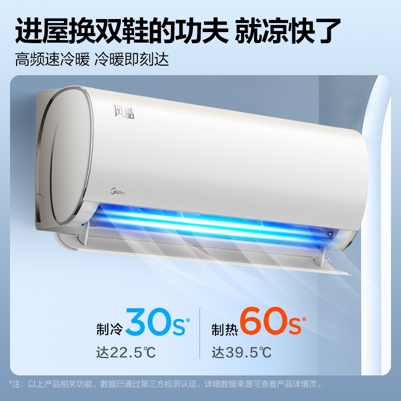 Midea 美的 风酷 KFR-35GW/N8XHC1 壁挂式空调 1.5匹,配备第二代导风板,送风范围更广,防直吹效果更好,支持上下左右摆风。基于智能PI控制器和高精度观测算法,压缩机快速高频启动,急速制冷热,一键开启“智控温”模式,先快速降温后,自动回温至体感舒适温度。显示屏智能光感,第四代自清洁,支持APP控制,0.5℃调节,无极风速。能效比5.27,新一级能效,循环风量630m3/h