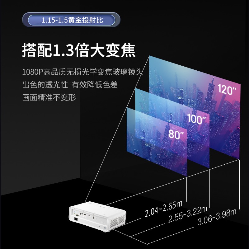 1.15-1.5黄金投射比,1080P高品质无损光学变焦玻璃镜头,出色的透光性有效降低色差,画面精准不变形。支持四向画面校正,搭载垂直+10%无损光学镜头位移,灵活安装更省心。通过Wi-Fi或者Type-C接口,即可轻松实现小屏投大屏。