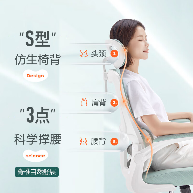仿生椅背设计,吻合身体自然脊椎曲度,头颈、肩背、腰部,均可得到妥帖的支撑感 久坐状态,脊椎也能自然舒展。分解支撑力量,腰部强受力,背部软贴合腰背分离工学设计,可以更好满足对腰椎的支撑,需求减少因腰部受力不足起的不适问题。