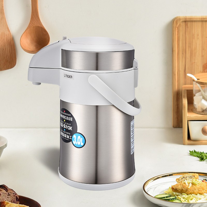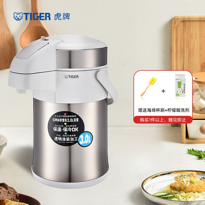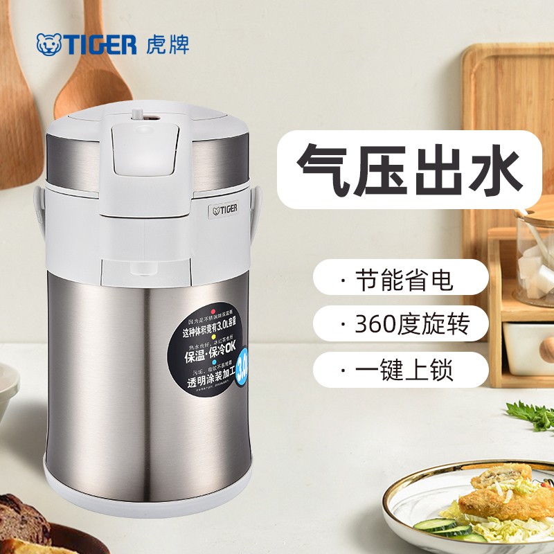 TIGER 虎牌 MAA-A30C 气压式保温壶,采用双层真空不锈钢材质,24小时53摄氏度以上,10小时69摄氏度以上,双重真空保温,即可保热,也可保冷,内部保洁加工处理,具有上锁功能,防止孩子误操作。