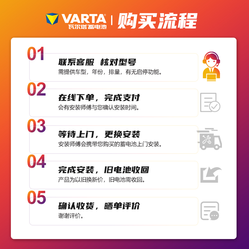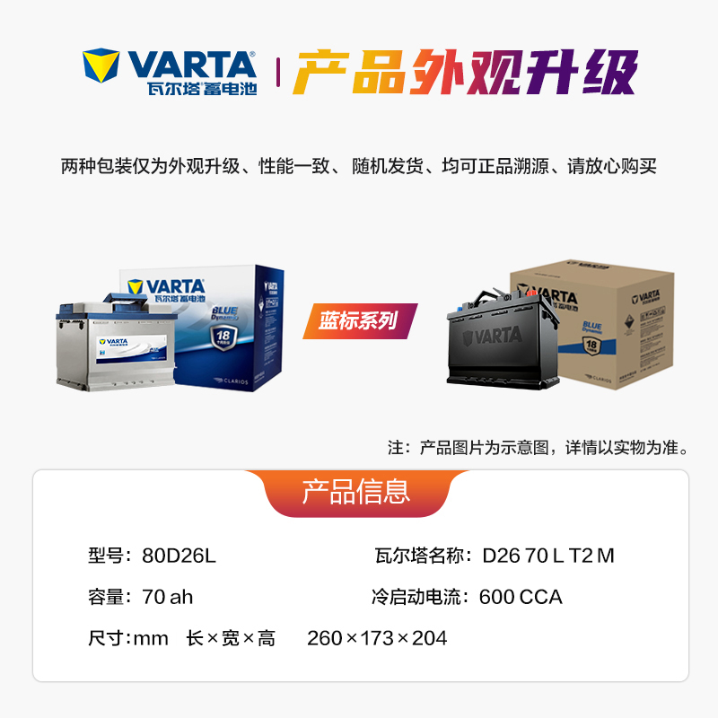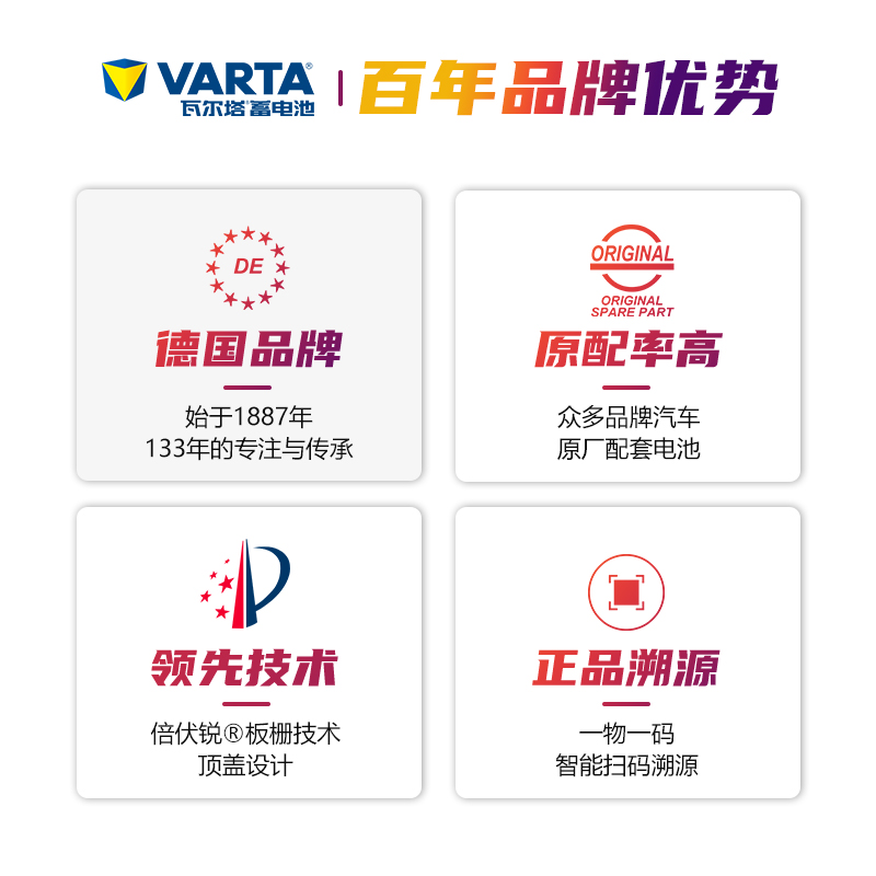 VARTA瓦尔塔蓄电池,是江森自控旗下欧洲最著名的汽车蓄电池品牌,1887年成立于德国哈根,2002年被江森自控收购其AG汽车蓄电池部门。作为全球著名的汽车蓄电池供应商,江森自控荣获众多整车厂奖项。此款蓄电池使用瓦尔塔独具的powerframe 倍伏锐专利板栅技术,启动强劲,降低引擎损耗,超低温启动,适应恶劣气候。专利顶盖设计,更安全,更节能环保。