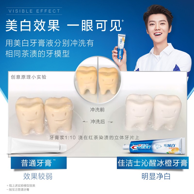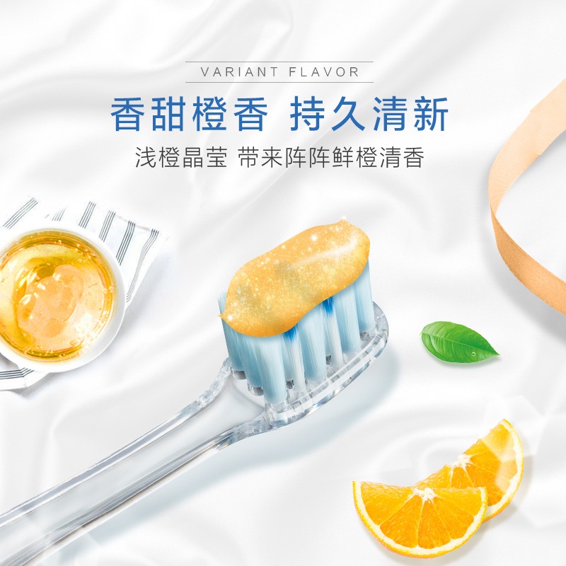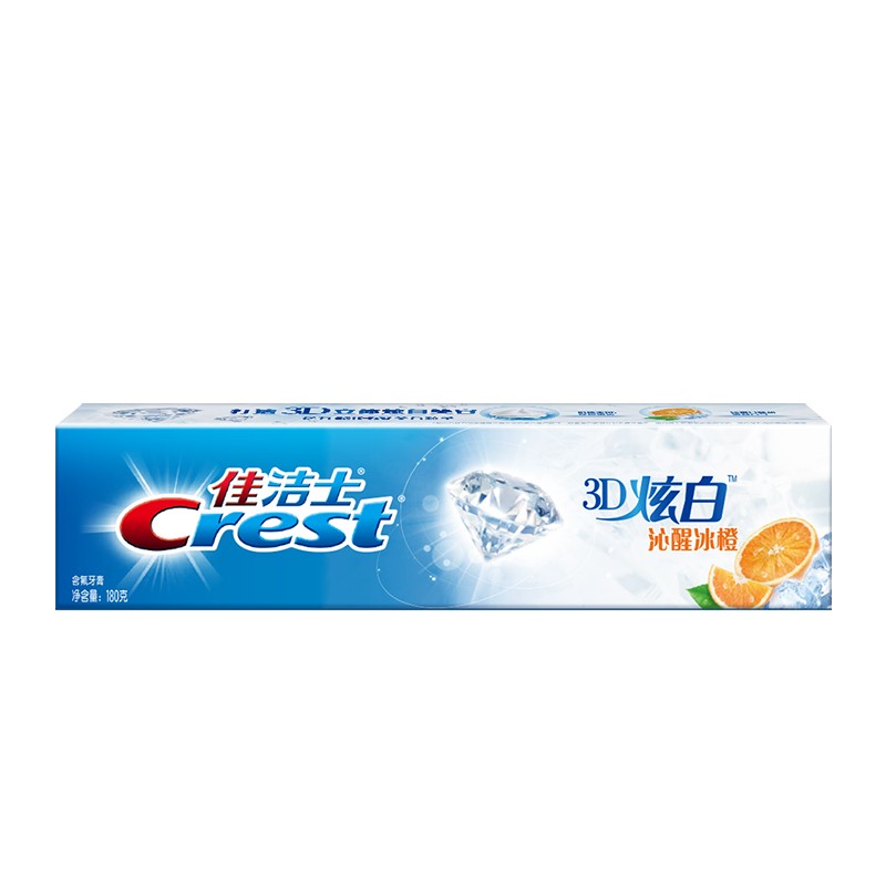 佳洁士(Crest)于1955年在美国成立。其推出的这款牙膏,膏体呈浅橙色晶莹质地,并带有清新鲜橙果香。内含MICA美白粒子,深层清洁口腔、清新口气的同时,去除污垢堆积,抵御色素沉着,减少牙菌斑和牙渍生成,令牙齿白皙莹亮,呵护牙周健康。