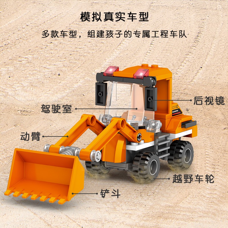 模拟真实车型,组建孩子的专属工程车队。战胜小挑战,收获大成就,颗粒数量适中拼搭简易。嵌合紧密,经久耐玩,车体夯实,摇晃、碰撞不易松散。