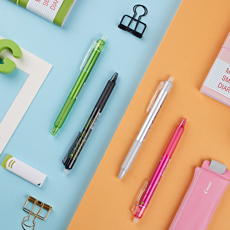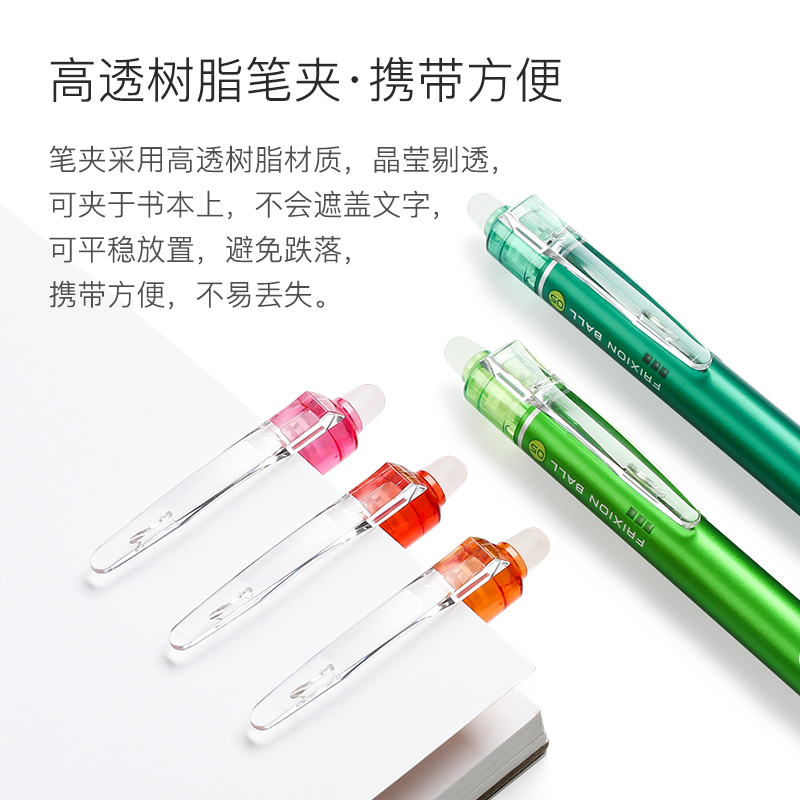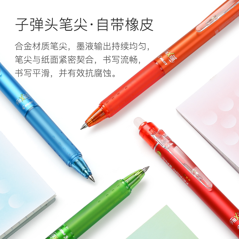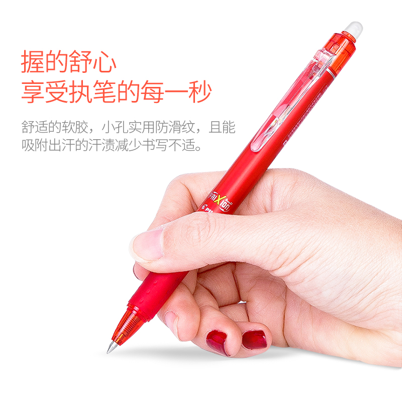 百乐的这款型号为LFBK-23EF的按动可擦笔,采用经过40年工艺积累研制的Frixion墨液,使用笔杆尾部带有的橡皮擦或百乐专门的可擦笔橡皮擦,能达到很好的擦拭效果,非其他品牌所能比拟。可擦笔原理是根据温度变化使墨水隐形,擦除过程不留屑。对于经常写错字的人群,是很不错的选择。不含有毒物质,按动式设计,软胶式笔握,笔芯顺滑流畅。缺点是墨液黑度不够,此外易擦特性使其不适合用于正式签字场合。