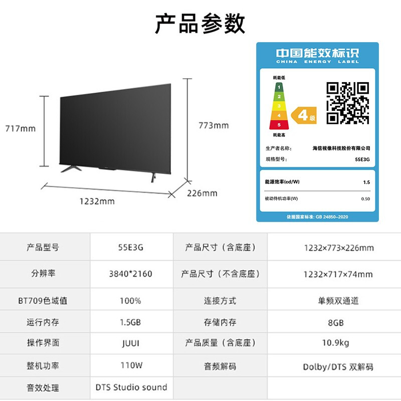 海信E3G系列包括55英寸、65英寸等版本,搭载U画质引擎,逐台校色,△E约等于2.5,支持AI智能动态画质调教,另有护眼模式、六维降噪、AI调光等六大技术让观看更舒适;采用2*12W扬声器,支持Dolby&DTS双解码;悬浮全面屏设计,屏占比99%,另外机身采用Unibody一体成型设计;支持AI远近场语音操控,支持多种投屏方式;采用4核64位处理器,1.5GB内存+8GB存储空间,配备HDMI2.0*2等常用接口。