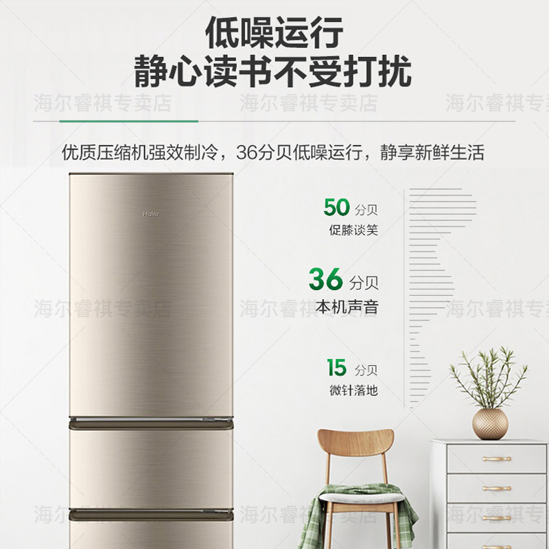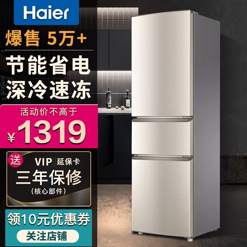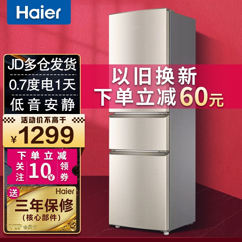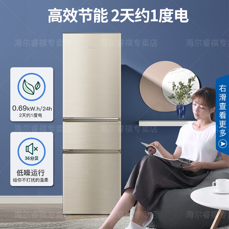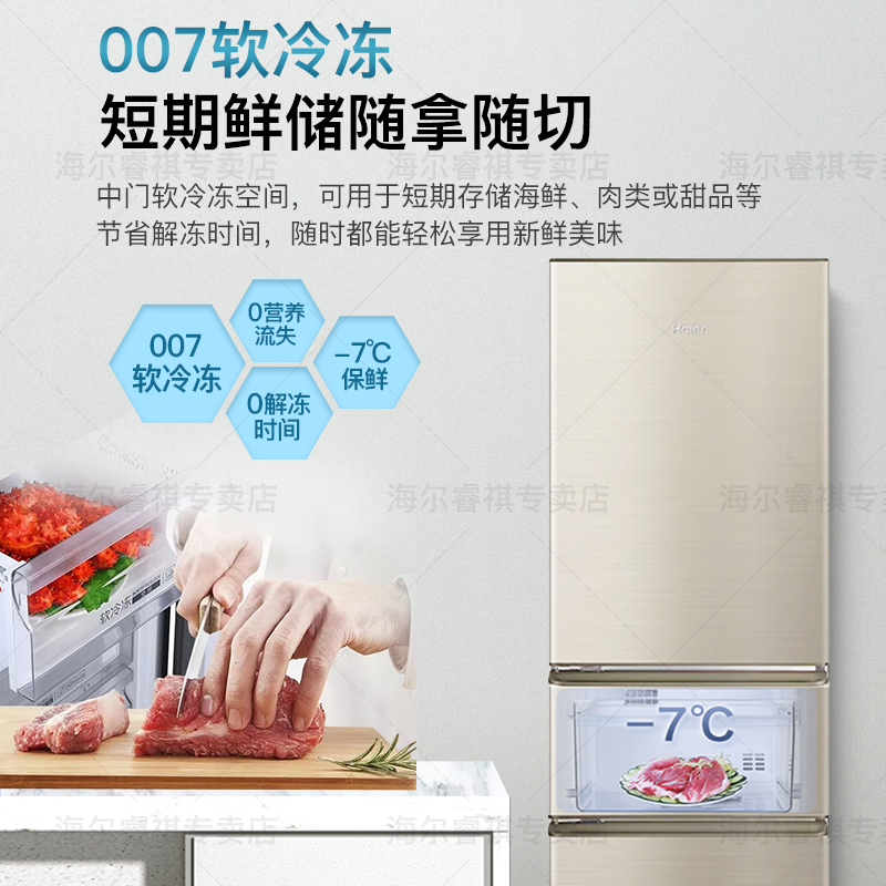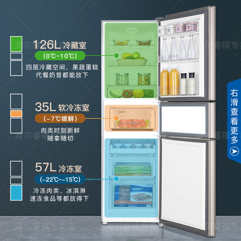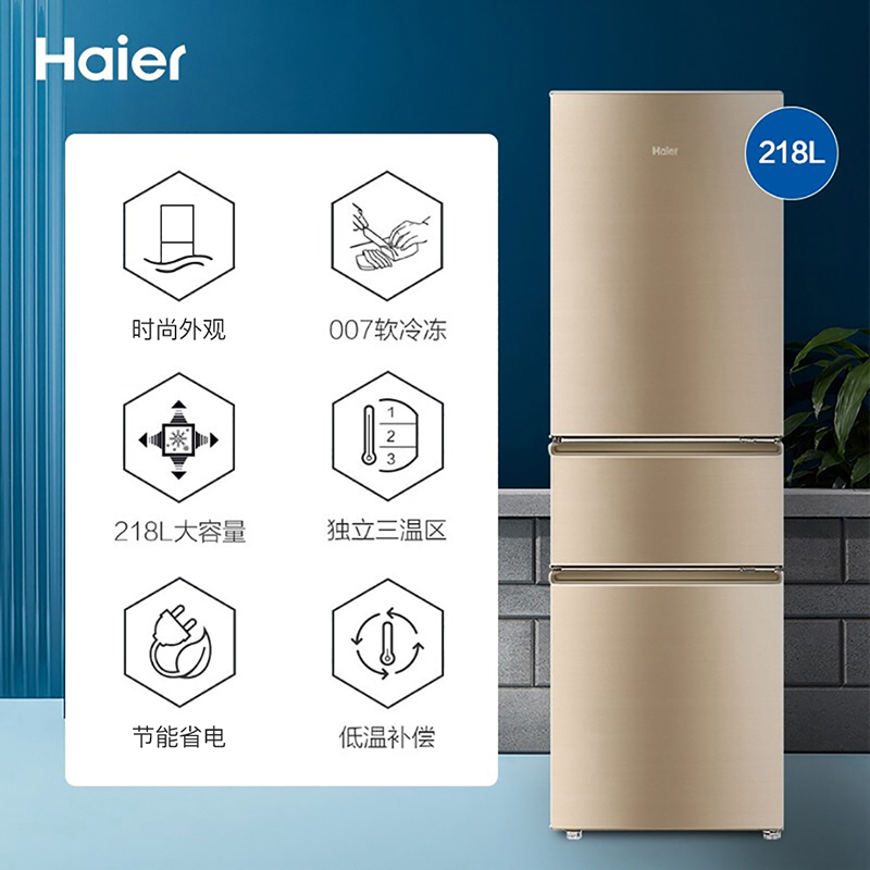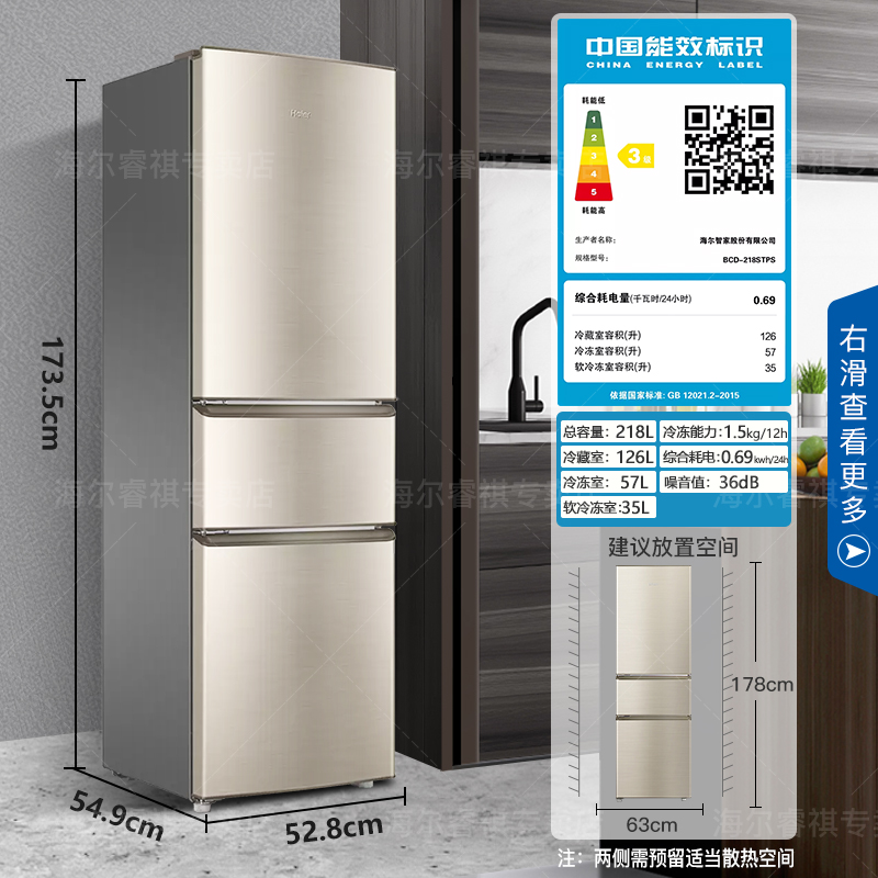 海尔 BCD-218STPS 三门冰箱,总容积218升,冷冻室57L,冷藏室126L,中门为软冷冻室35L,-7℃保鲜,0解冻时间随取随切,0营养流失口感如初。低温补偿功能,实时感知外界环境温度,避免低温环境下高耗电和停机现象,冰箱内温度更均匀。采用R600a冷媒,铝制蒸发器直冷制冷,综合耗电量仅为0.69kwh,3级能效,冷冻能力为1.5kg/12h。
