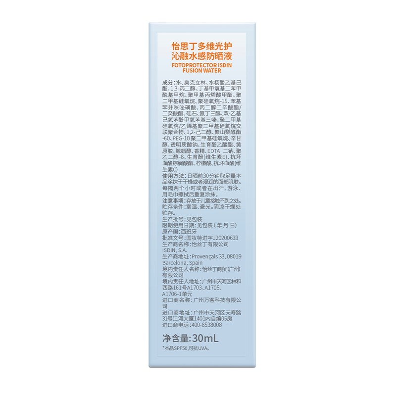 1975年,奢侈品集团PUIG与百年制药世家ESTEVE联合创立ISDIN,以医药学的标准,严格生产护肤品。 这款多维光护沁融水感防晒液,含有透明质酸和维生素E,水水润润,后续上妆无压力。SPF高达50+,可以迅速成膜,全天保护。无油配方,一抹化水,不搓泥不泛白。无泪配方不熏眼,敏感肌也可以安心使用。在暴露在阳光下的前30分钟使用本品。