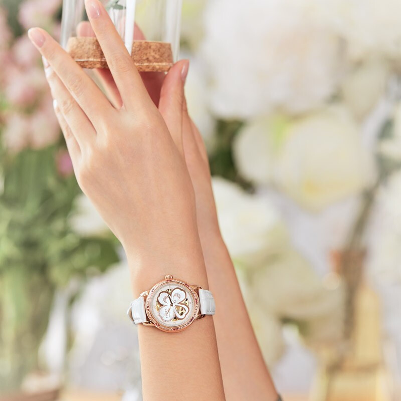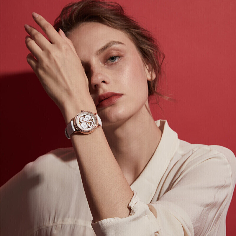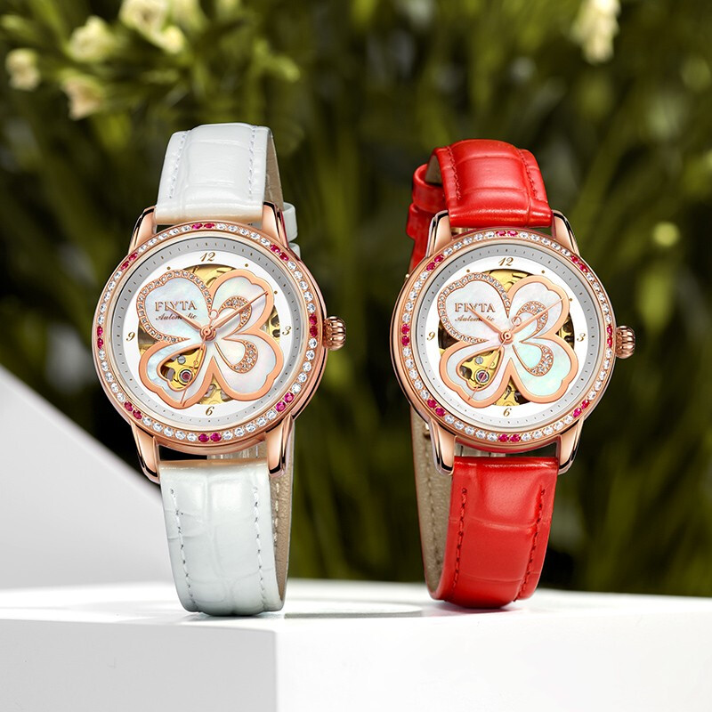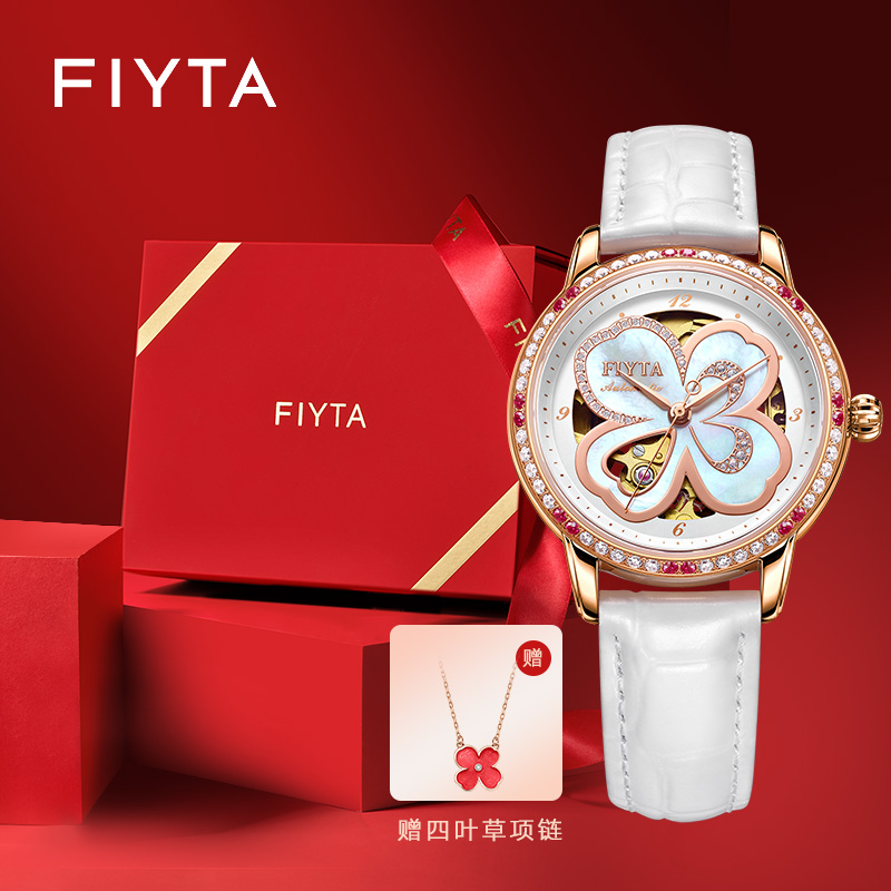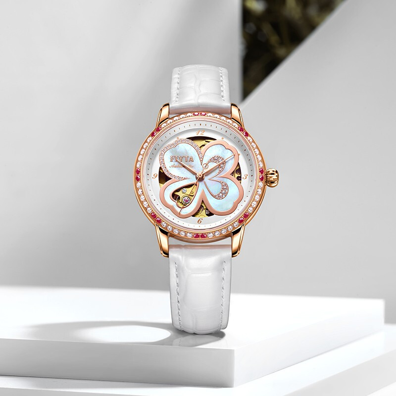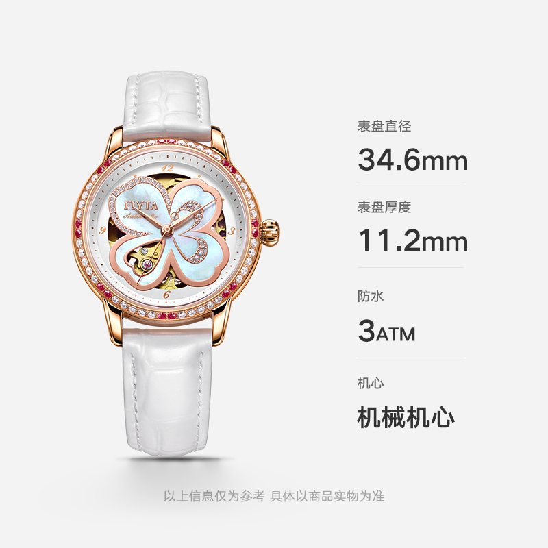 飞亚达(FIYTA)推出的这款34.6毫米腕表,搭载自动上链机械式机芯,走时稳定。具有30米防水性能,满足日常防水需求。采用防眩光合成蓝宝石表镜,防刮耐磨且读时清晰。珍珠贝母表盘设计成四叶草镂空造型,精致美观。牛皮表带贴合手腕,佩戴舒适。