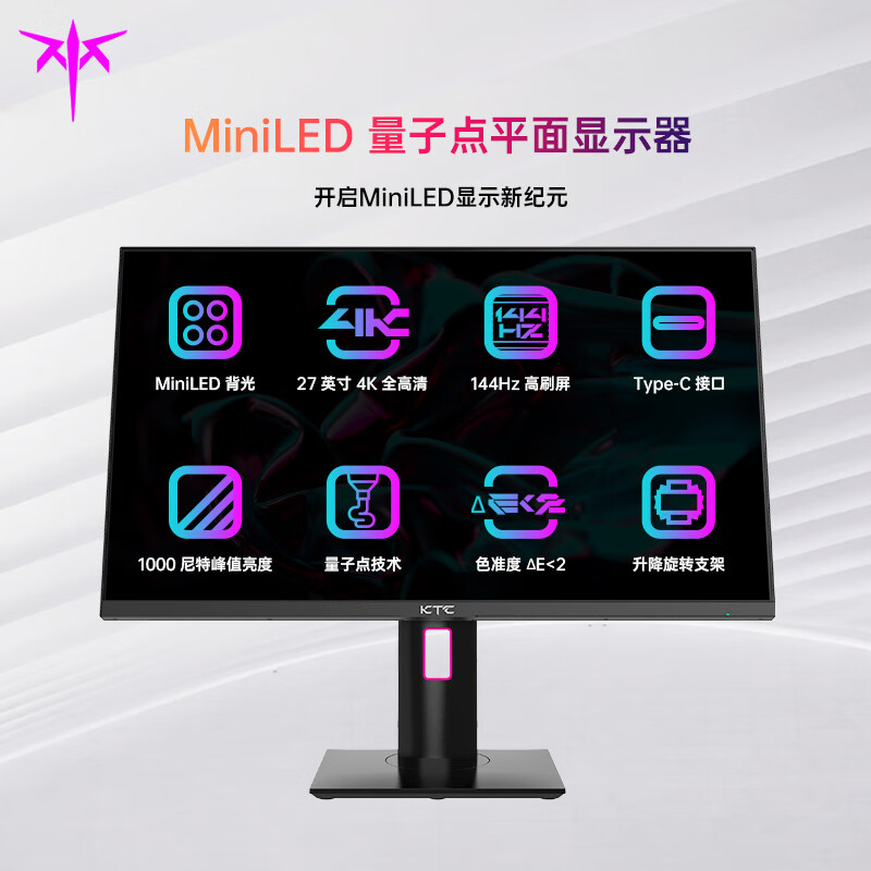 KTCM27P20是一款27英寸 Mini Led专业显示器。具有576个分区,2304颗灯珠,具备4KUHD分辦率和99%DCI-P3高色域。峰值亮度达到1000尼特。deltae<2专业级出厂校色,对比度1000000:1,搭载144Hz高刷新率屏幕和1ms反应时间。附带90WType-C反向供电技术,一线解決视频连接与充电。自带2Wx2立体声音响,声光一体。支持满血HDMI2.1接口。