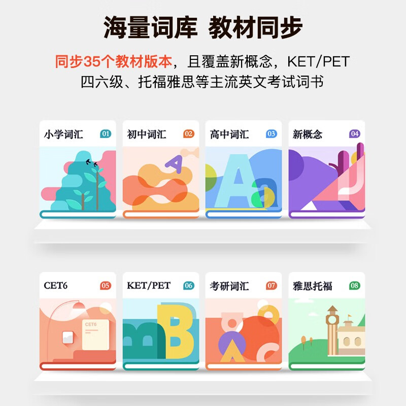 内置英美双音领读,更地道,发音准学得好,边背边听,刺激听觉神经、视觉神经、触觉神经,让大脑记忆更深刻,结合字母发音规律及联想记忆效率更高;可同时满足扬声器外放&接入耳机两种发声模式,针对不同场景需求,满足不同学习方式;海量云端词书,从小学到考研,一应俱全单词释义丰富、短语例句搭配、近义词记忆,同时可自建专属词书,更精、更准;