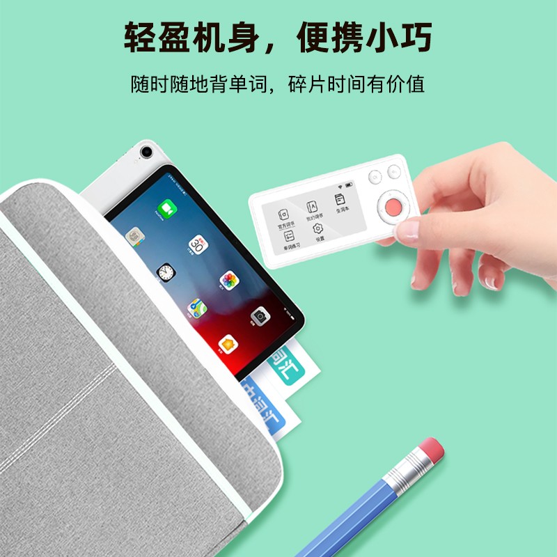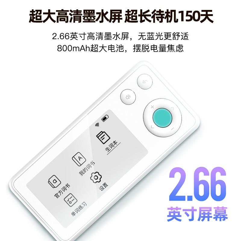 内置海量词书之外,还能根据个性化学习需求,通过手机APP进行单词拍照录入,快速添加专属词书;机身轻巧便携,易于装入背包口袋,随时利用碎片时间背单词,2.66吋屏幕,更大尺寸,一目更多行;一次充电可连续学习100天,长时间无操作的情况下,单词卡将自动进入低能耗待机模式按任意键即可再次唤醒。电子墨水屏带来清晰阅读观感,即使在户外使用,也能拥有良好体验,无蓝光不伤眼,减缓视觉疲劳。