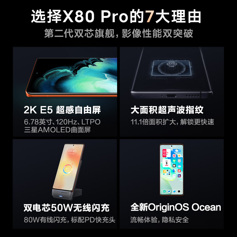 屏幕方面,vivo X80 Pro搭载了6.78英寸 三星2K E5 AMOLED屏,采用超声波屏幕指纹,最高支持120Hz屏幕刷新率,1000Hz瞬时触控采样率,局部最大峰值亮度亮度1500nit,拥有10bit色彩深度,支持100% P3广色域,支持LTPO自由帧率3.0,可根据场景自动调节1-120Hz刷新率。