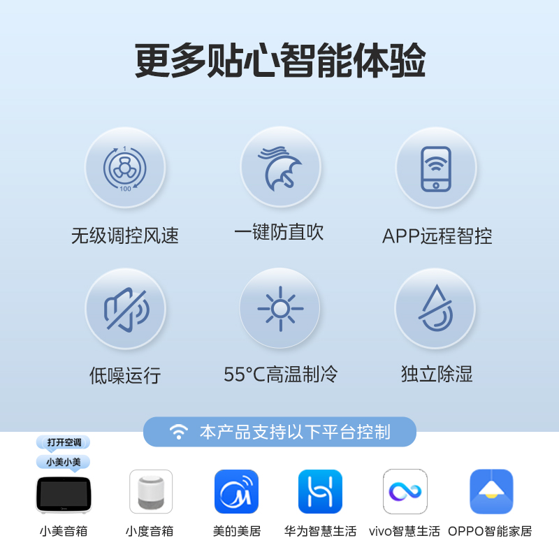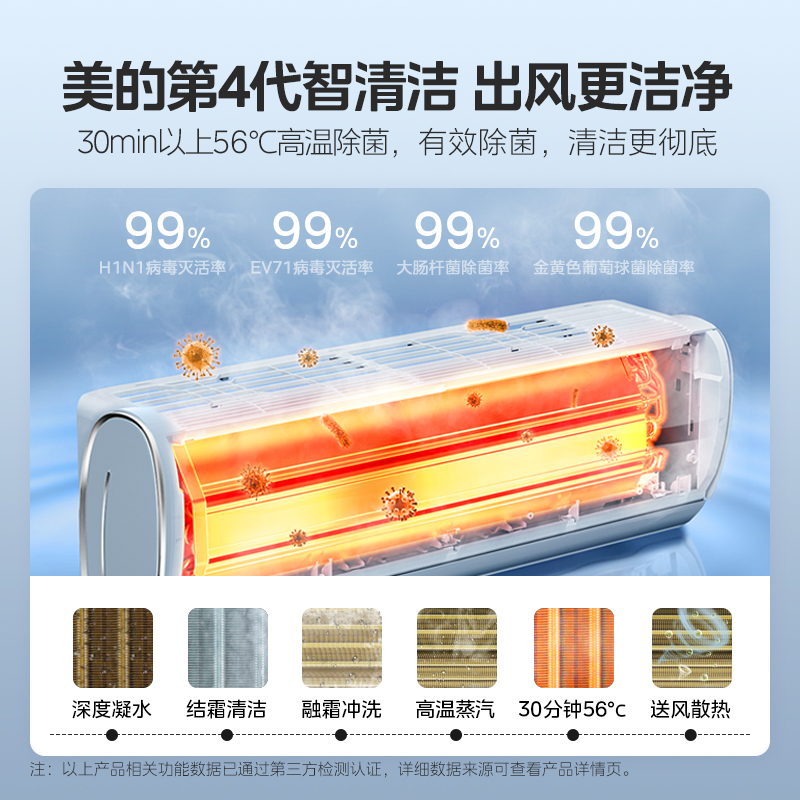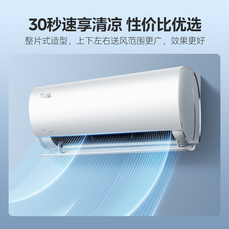 Midea 美的 风酷 KFR-35GW/N8XHC3 壁挂式空调 1.5匹,配备第二代双层导风板,送风范围更广,防直吹效果更好。基于智能PI控制器和高精度观测算法,压缩机快速高频启动,急速制冷热,一键开启“智控温”模式,先快速降温后,自动回温至体感舒适温度。显示屏智能光感,第四代自清洁,支持APP控制,0.5℃调节,无极风速。能效比4.29,新三级能效,循环风量650m3/h。