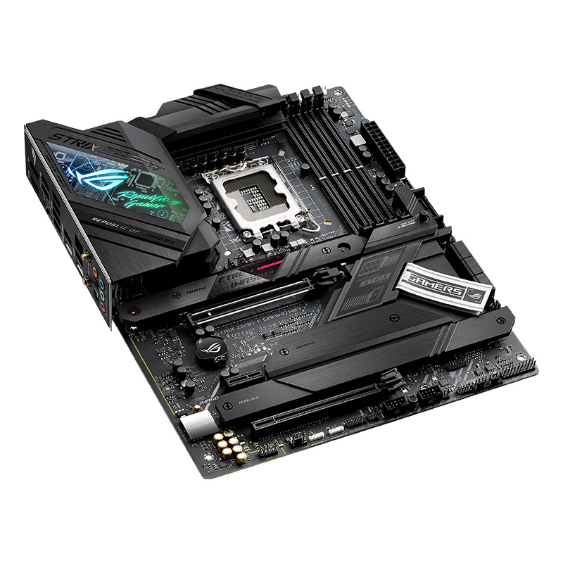 ROG Strix2690-E Gaming Wifi是 ROG STRIX家族的旗舰机型,配备个PCIe5.0x16插槽和一个板载 PCIe5.0M.2插槽,让发烧友有机会在PCIe5.0显卡和SSD上市之初享受到较快的速度体验。带有直触式热管的M.2散热冰甲増加了散热表面积,更快速地为高性能SSD降温。未来派的外观,金属拉丝饰面、I/0护置彩虹色 ROG LOGOI以及 AURA SYNC灯效,都让这款强大的主板脱颖而出。