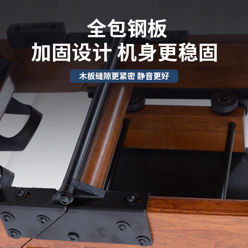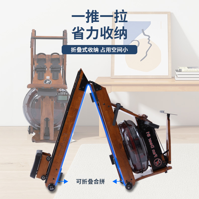 采用泰国橡胶木,实木轨,纹理清晰流畅自然美观,质地坚硬,不含人造板和贴皮,NSK轴承,持久顺滑。聚氨酯软包滚轮,顺滑舒畅,降低噪音。附带燃脂互动APP,让你身临其境,智能电子表,数据显示,一目了然,实时监控自己的运动状态,18叶桨,无级变速,机身长2.16米,折叠占地面积0.3立方米,收纳方便,不占地,解决你的空间焦虑。聚碳酸酯水箱,高透光,抗冲击,耐腐蚀,耐高温,人体工学设计,加大斜度,脚踝更舒适,减少关节损伤。更有手机平板放置槽,多档可调节脚踏,人体工学座椅等细节设计,让你畅享健康健身生活,一台机器就能锻炼全身大部分肌群。