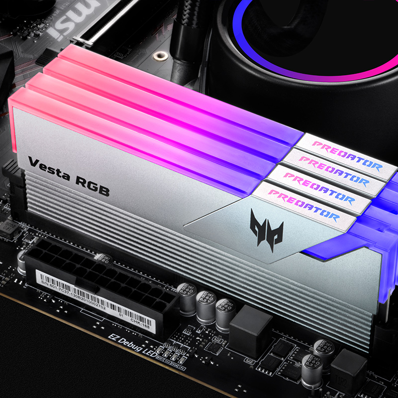 PREDATOR Vesta 炫光星舰系列 采用特挑B-Die颗粒,相较于其他超频颗粒具备更强的耐电压和高温的能力,4000MHz高频,同时具有CL15的低时序,定制10层加强PCB板设计,15μm金手指,提高了拔插、抗氧化的性能,使内存条数据传输稳定性大大提高,内置温度传感器,玩家可实时监测内存温度,超频体验更加便捷、可控。