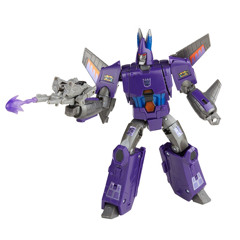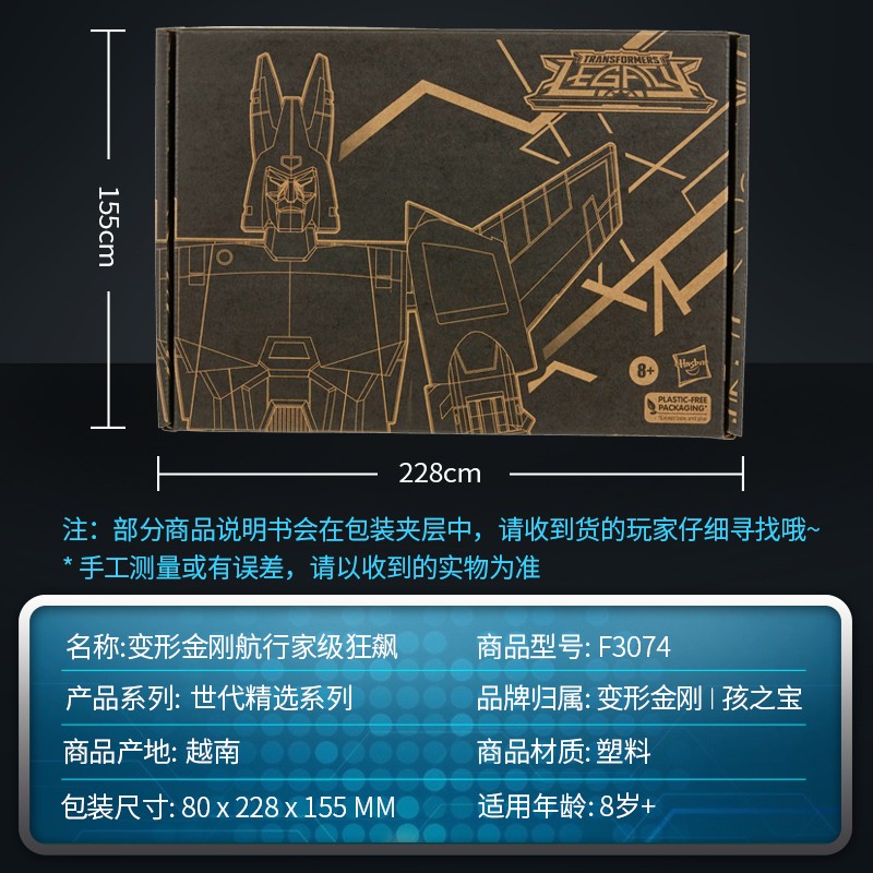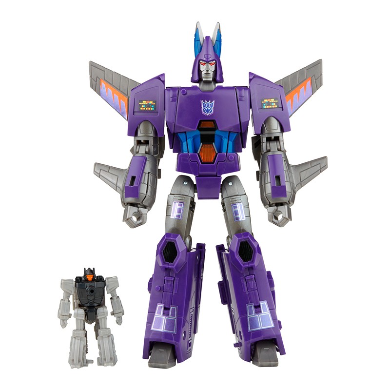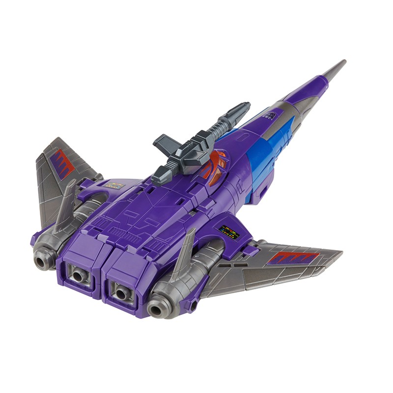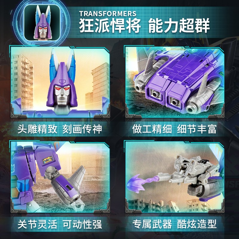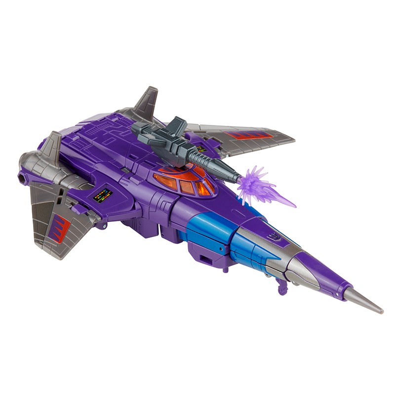 经典紫灰色涂装,表情邪恶,十分还原86大电影中狂飙的形象,在效果贴纸的加持下,造型更加酷炫。附带1个目标战士、1把枪和2个效果配件,目标战士变形为爆能枪后可作为狂飙的武器,玩法多样。狂飙33步从机器人变形为喷气式战斗机,武器装备在机顶,两种形态的造型都十分利落帅气。警棍也可4步变形为爆能枪。